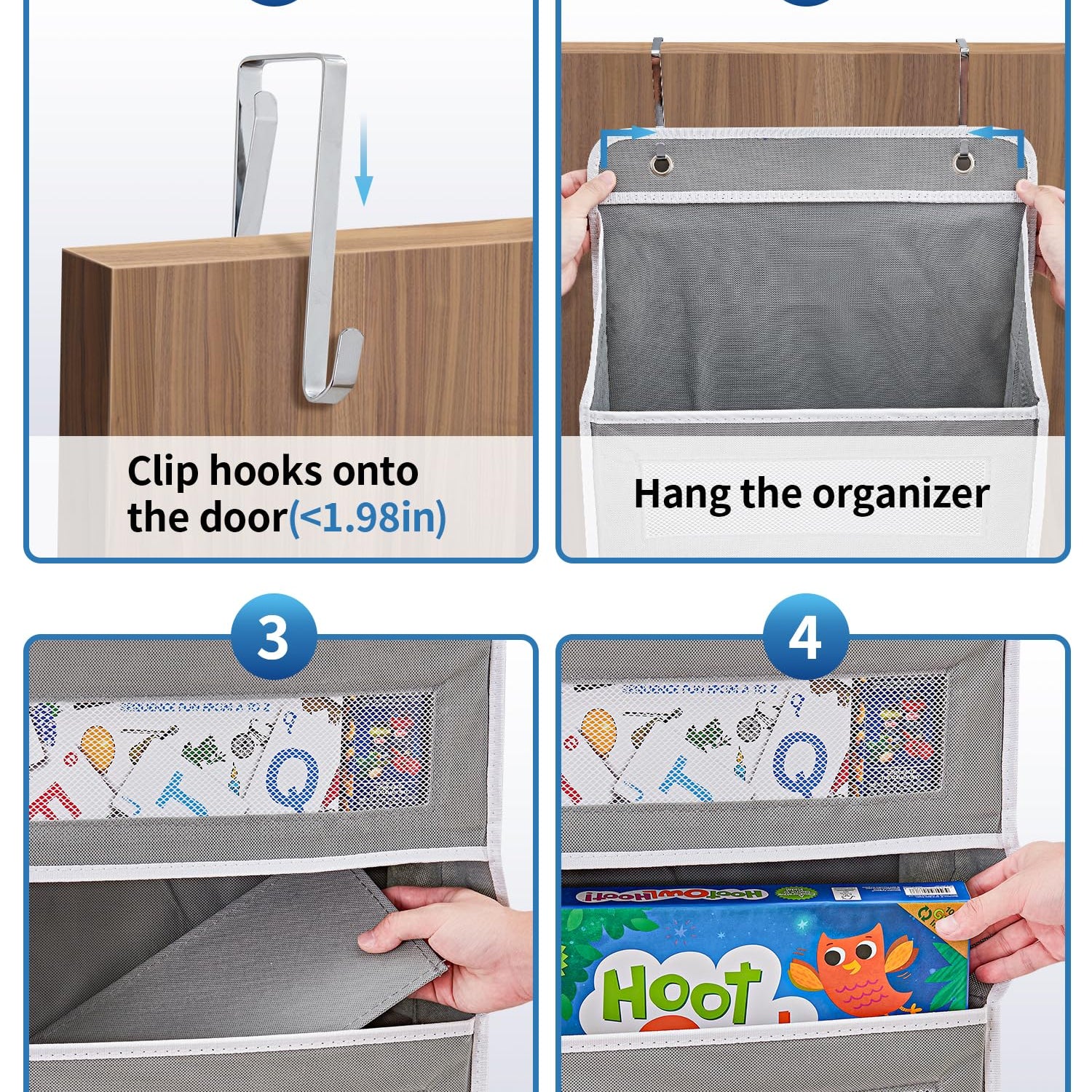 - Easy to Assemble: Set up the toy storage organizer in a mere 30 seconds. Simply hang the hook on the door, hang the organizer onto the hooks, and insert the 5 bottom cardboards. With special metal hooks designed to fit doors up to 1.98" thick, enjoy a hassle-free and versatile installation experience.