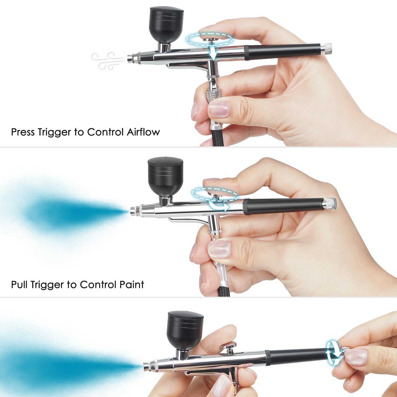 - đăTriple-Action Airbrush Gună Unlike the single-action air brush that only controls airflow, the aerografo features a triple-action design, allowing independent adjustments for airflow, paint release, and paint flow. Press the trigger to release airflow, pull the trigger to release paint, and rotate the rear to precisely adjust the paint flow. This makes the operation easier and spraying more detailed.