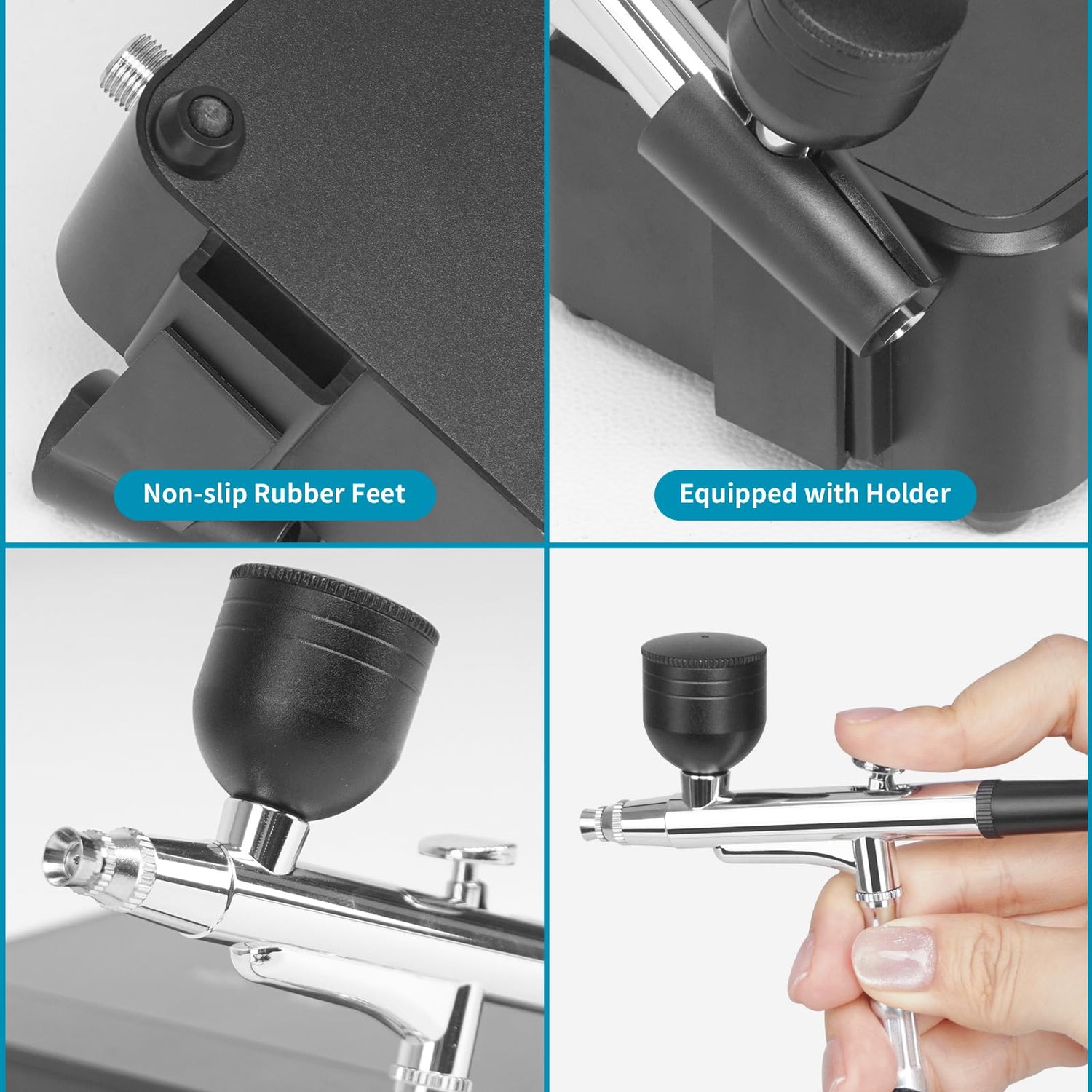 - đ ăAll-in-One Airbrush KităIncludes everything you need: cleaning kit, triple-action airbrush, 3-level air compressor, 3 nozzles (0.2/0.3/0.5mm), adapter, 6.5ft air hose, holder, oil-water separator, and capacity cups (20/40cc).