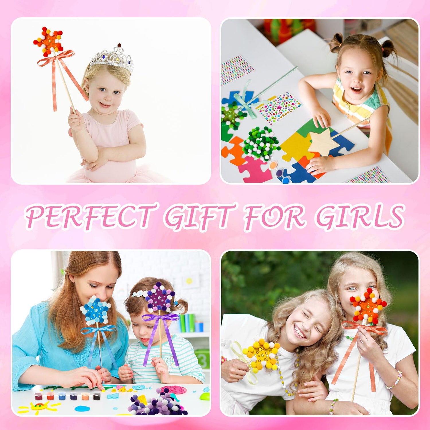 Princess fairy wands kit include 20 pcs unfinished wooden magic wands, 6 colors ribbons, 600 pcs felt balls, 4 packs of gem stickers, 12 colors paint and 2 brushes, rich accessories for your creation.