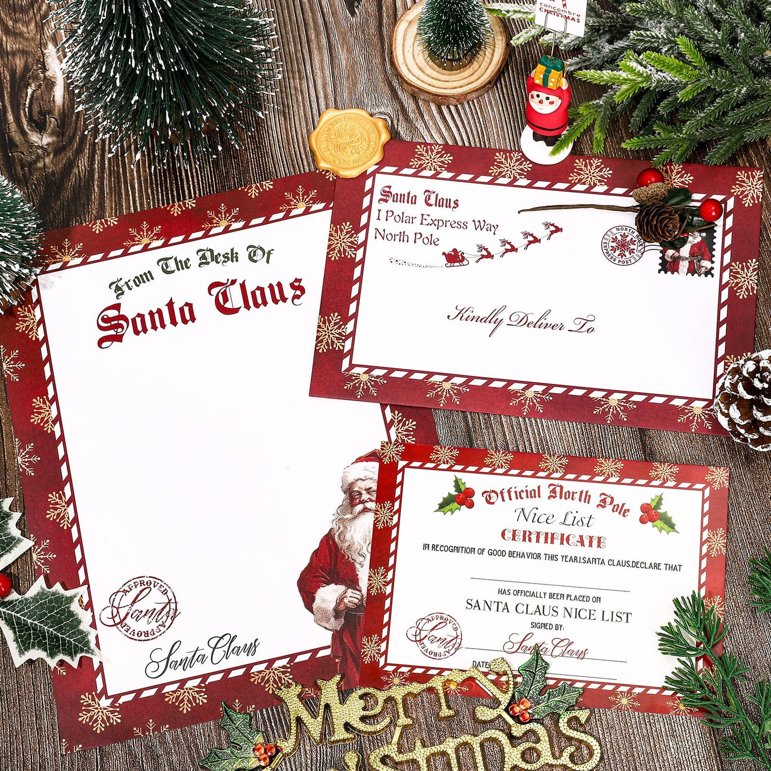 - WHAT YOU GET: 5 sheets of vintage style red writing paper bordered with gold snowflakes, 5 official North Pole certificates, 5 envelopes and 10 sealing wax stickers, enough to give as gifts to your family or students