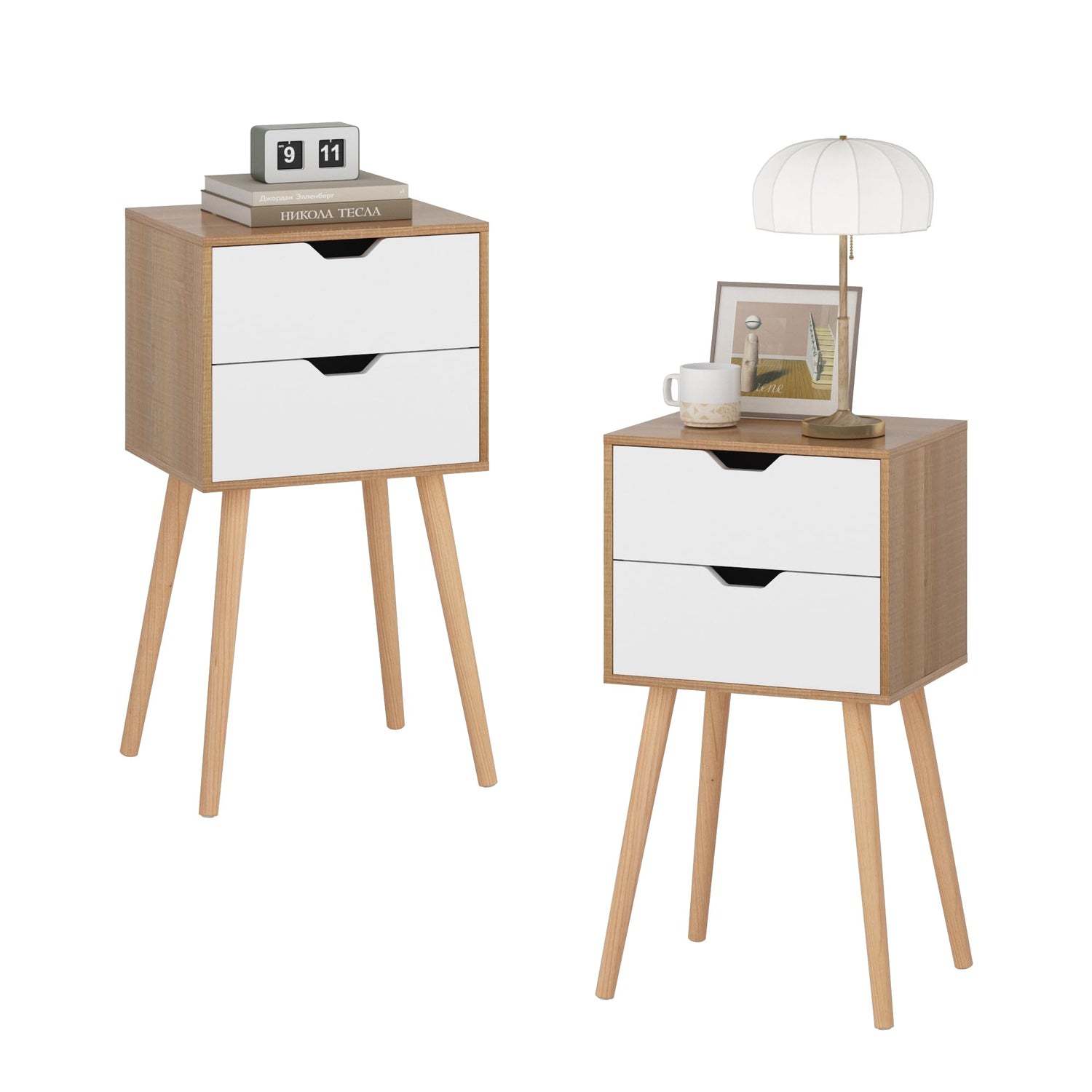 Details: Specification: Number of drawer: 2 Material: MDF+NC paint + solid wood leg Color: White& Wood Color Product size: 15.7"L x 11.9"W x 28.1"H Leg length: 15.7â Package Includes: 2 x Bedside side table 1 x Screw fittings 1 x Instruction