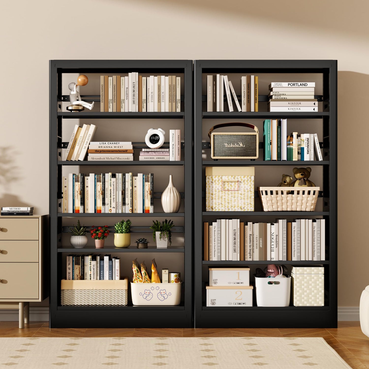 Jazipic 5-Tier Bookcase with Adjustable Storage Shelves, Heavy Duty Bookcase, Metal Bookshelf with Book Stopper, Black Bookcase Shelf for Library, Office, Living Room