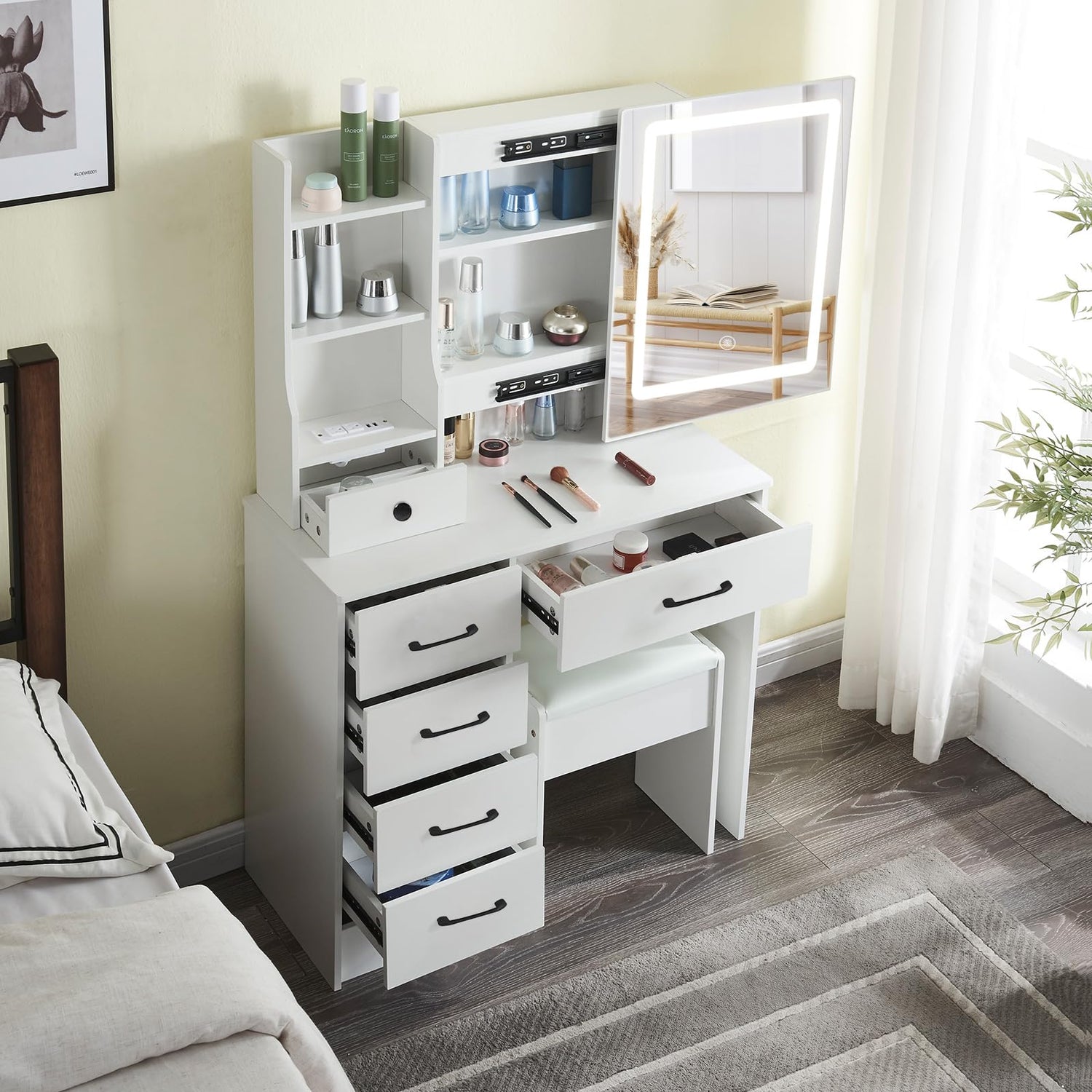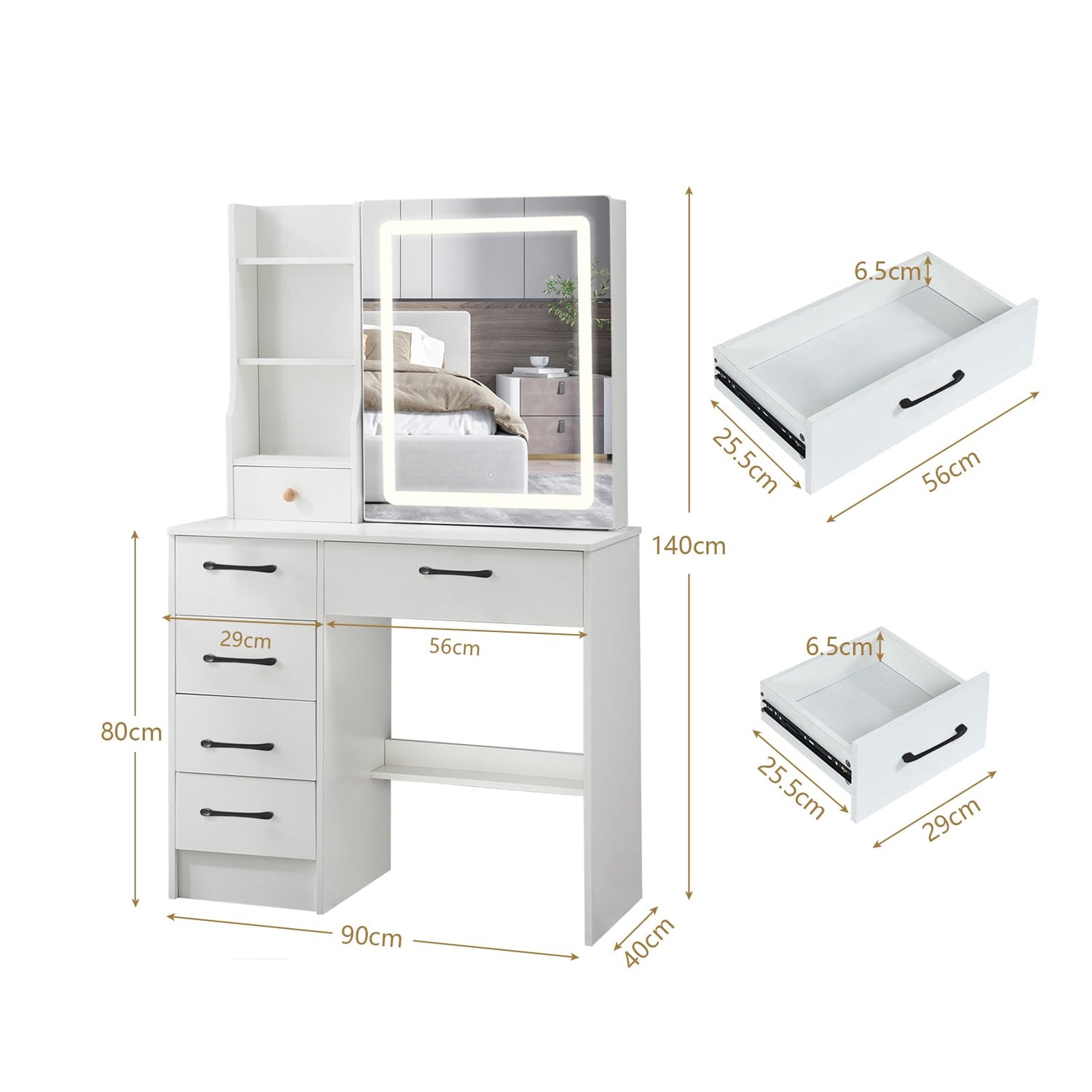 JBLCC Vanity Desk with Lighted Mirror, Large Makeup Vanity with Sliding Mirror, Storage Drawer & Chair, White Vanity Set Dressing Table for Bedroom (QW56LED)