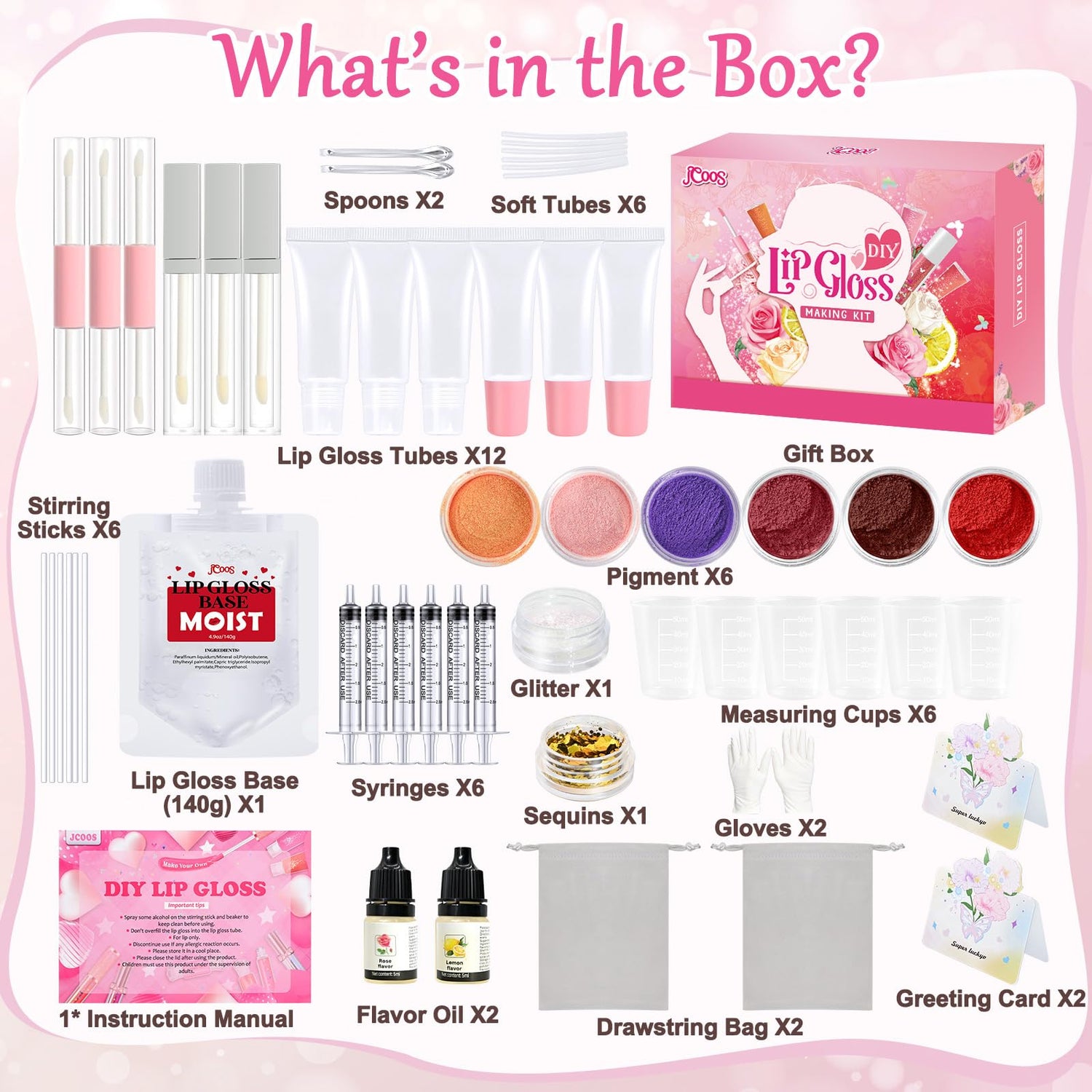 - JCOOS IDEAL LIP GLOSS MAKING SUPPLIES: 56PCS lip gloss set includes 1 lip gloss base(140g), 6 lip gloss pigment, 2 lip gloss flavoring oil, 1 glitter, 12 lip gloss tubes, 1 sequins, 2 greeting cards, 2 drawstring bag, 2 spoons, 6 measuring cups, gloves, 6 stirring sticks, 6 syringes, 1Instruction. A diy lip gloss making kit to meet your needs