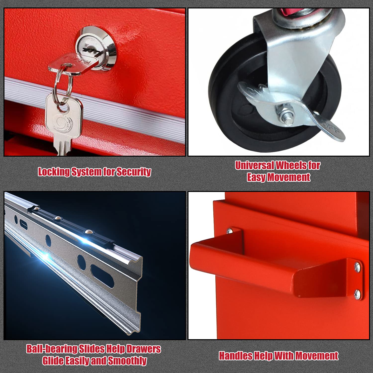 - 👍【 HIGH QUALITY MATERIAL】:The tool chest is made of high quality cold rolled steel with a coating of paint to prevent rust, which makes the tool chest sturdy and durable. Rubber wheels make it move quietly and smoothly.
