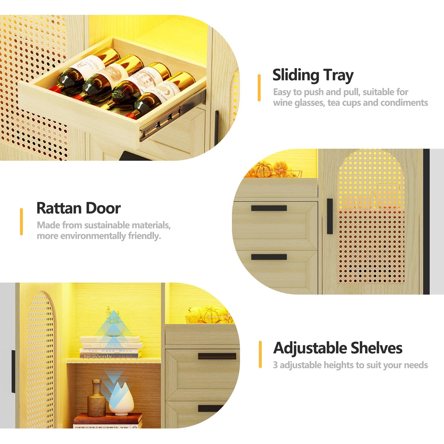JDPAG 40” Rattan Sideboard Buffet Kitchen Storage Cabinet, LED Coffee Bar Cabinet with Charging Station, Cupboard Console Table with Adjustable Shelves (Natural)