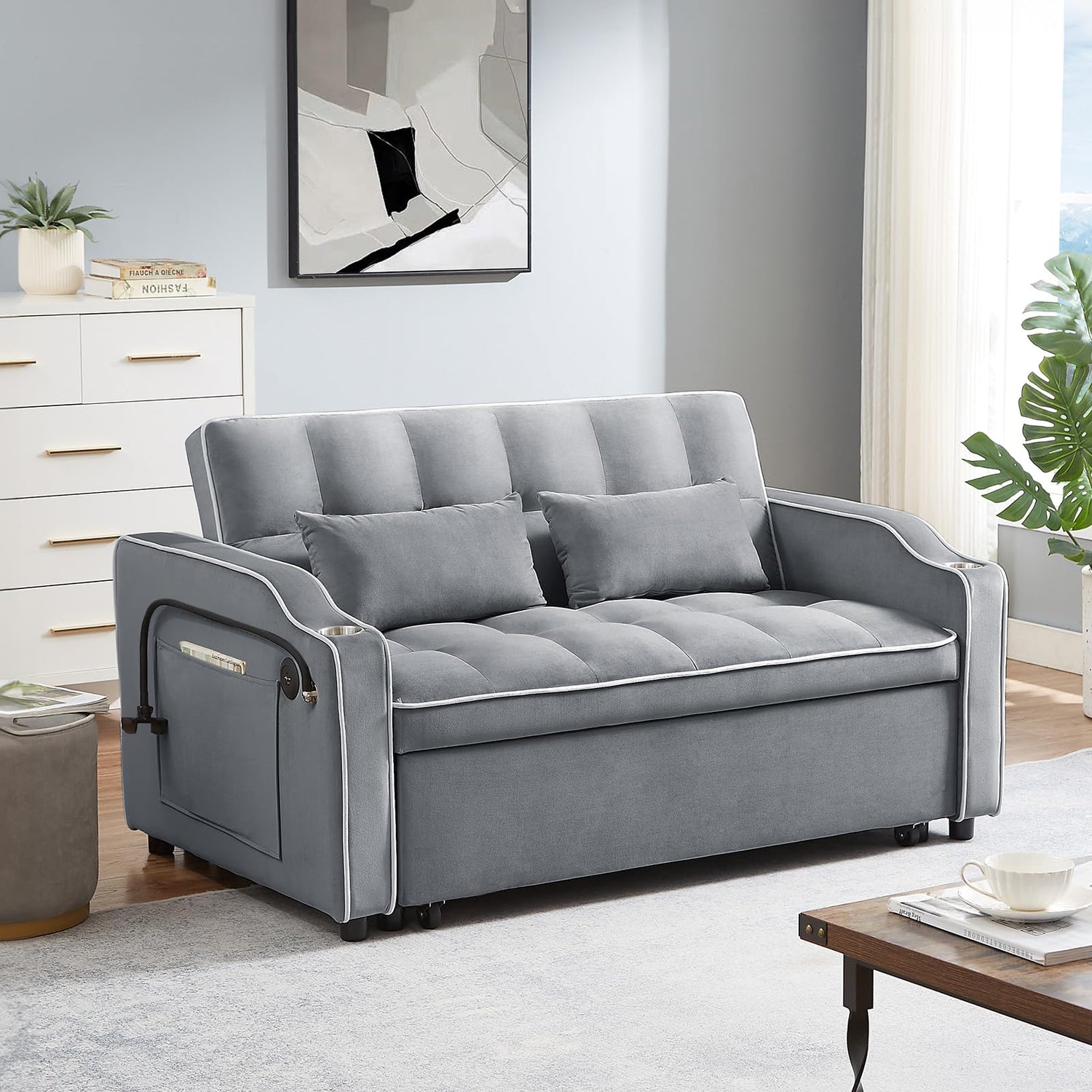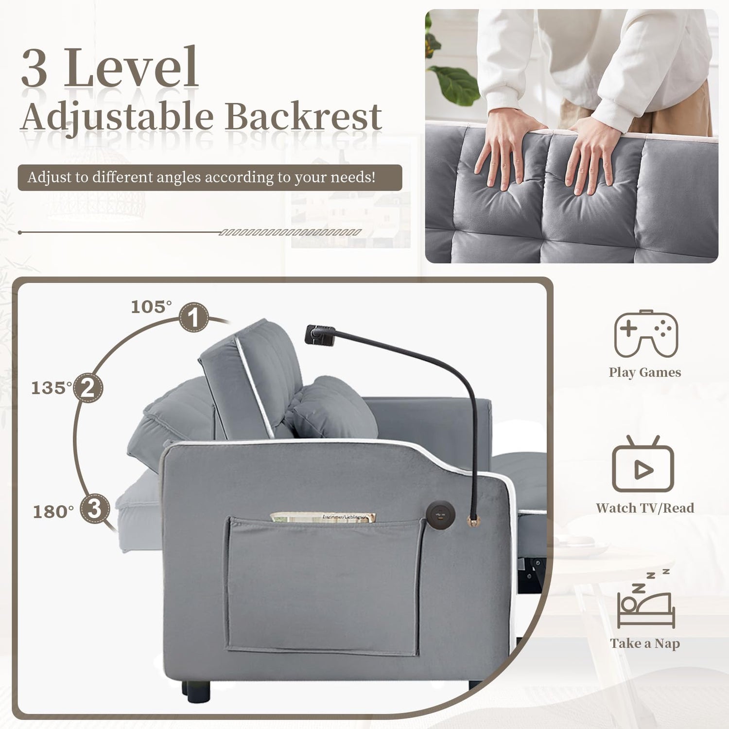 JEEOEHY 3 in 1 Convertible Sleeper Sofa Bed,Velvet Pull Out Couch Bed w USB&Type C Port,Comfy Futon Loveseat w Adjustable Backrest&Phone Stand&Cup Holder for Living Room Apartment Small Space(Grey)