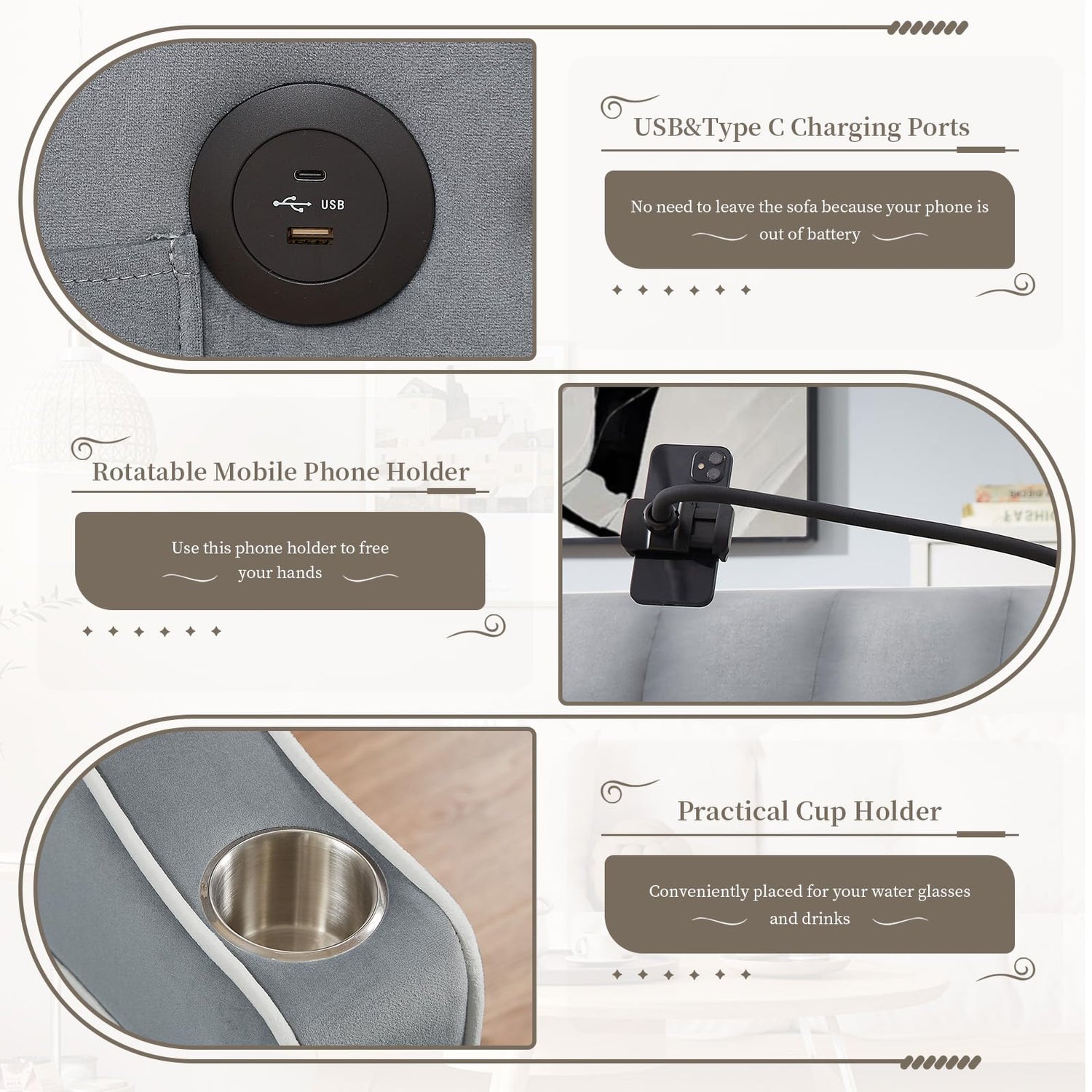 - Convenient & Practical Design: The armrests of the sofa bed are equipped with 1 USB port,1 Type C port, 2 cup holders, a mobile phone stand and side pockets. So you don’t have to leave the sofa due to your phone battery is exhausted! The phone holder keeps your hands free, and the side pockets can store small items within easy reach. This sleeper sofa bed is a great choice for reading, having a drink or taking a nap after a busy day at work