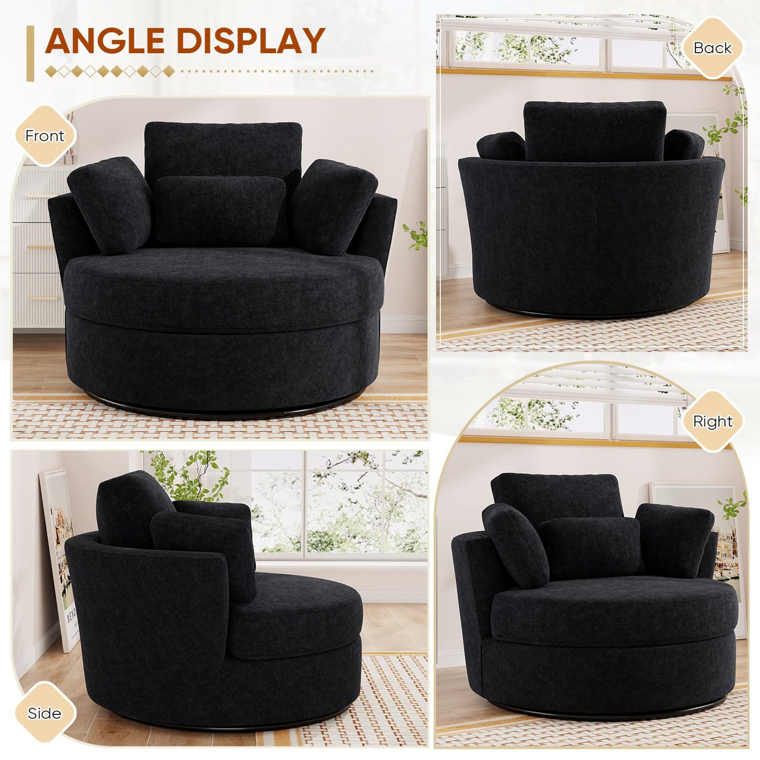 - Comfy Swivel Barrel Chair: The surface of our swivel accent chair is made of high-quality chenille fabric, which is gentle and skin-friendly. The back cushions and seat cushions are filled with high-density foam cushions, which are soft and comfortable, have strong resilience and are not easy to sink. The thick cushion provides wrapping and support, and the 2 arm pillows provide additional support. Allowing you to fully relax in the round swivel chair and enjoy a wonderful leisure time.