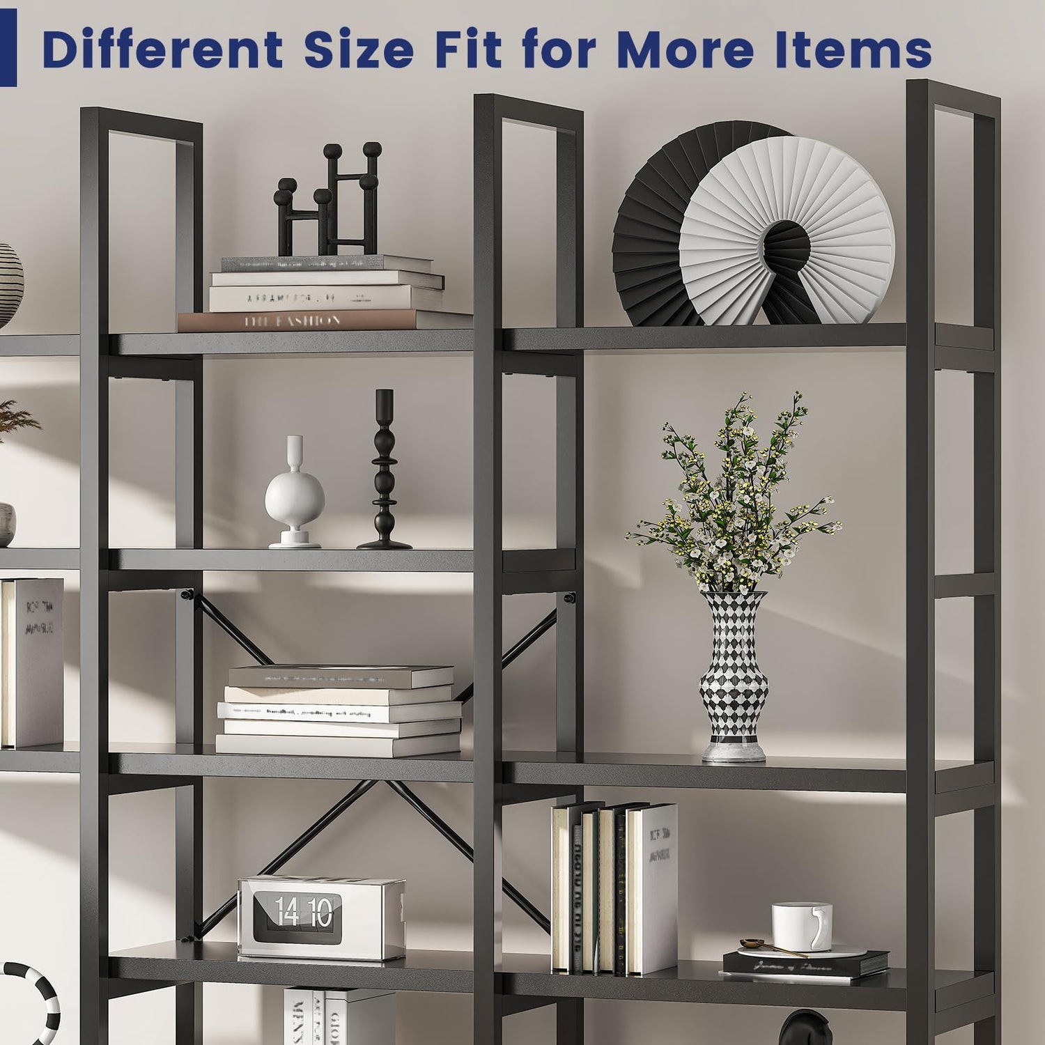 Jehiatek Large Bookshelf 5 Tiers, Triple Wide Geometric Bookcase, 71 Inches Tall Industrial Book Shelves Etagere Book Case, Sturdy Metal Frame, Freestanding Display Shelving Unit, Black