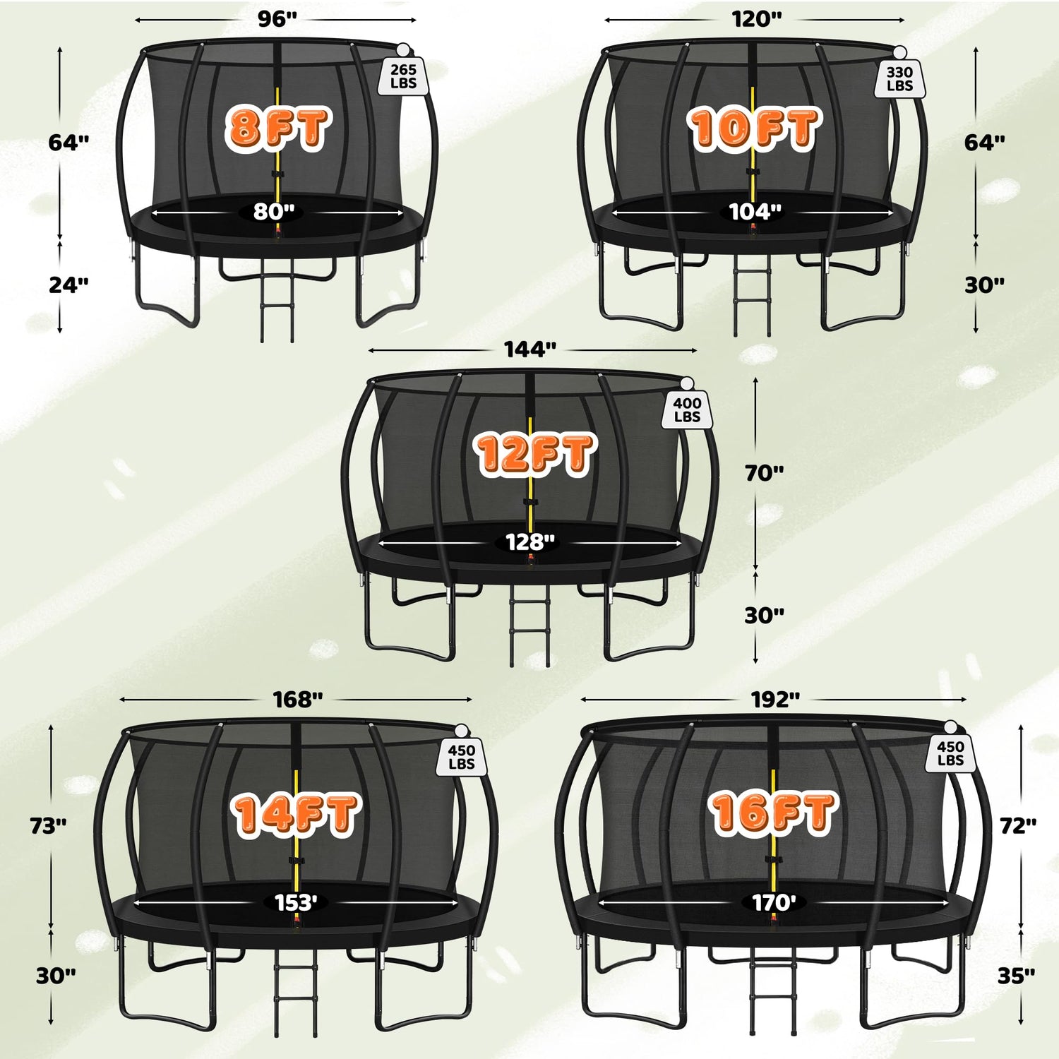 - 【Safety is Top Priority】You do not need to worry about any safety issues when using our trampolines, our trampolines comply with ASTM F381-16 standard safety specifications, which can guarantee safety during use. The fence net is made of tightly woven and durable materials and has a secure distance from the curved fence, both you and your children can enjoy bouncing without any apprehension. At the same time, the more space between kids and poles can also allow them to play more freely.
