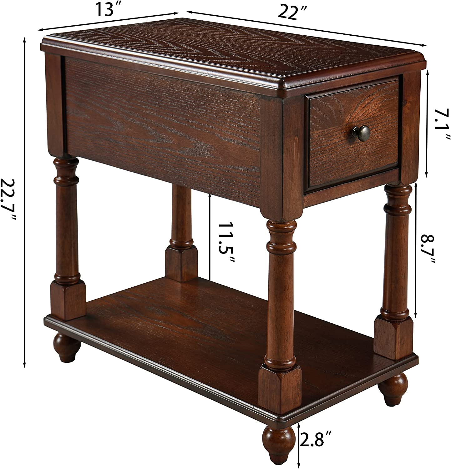 JESONVID Narrow Open End Table with Drawer, Solid Wood Side Table 2-Tier Skinny Table with Storage Shelves Slim Nightstand Small Sofa End Table for Living Room Bedroom-Cherry Walnut 004DWA