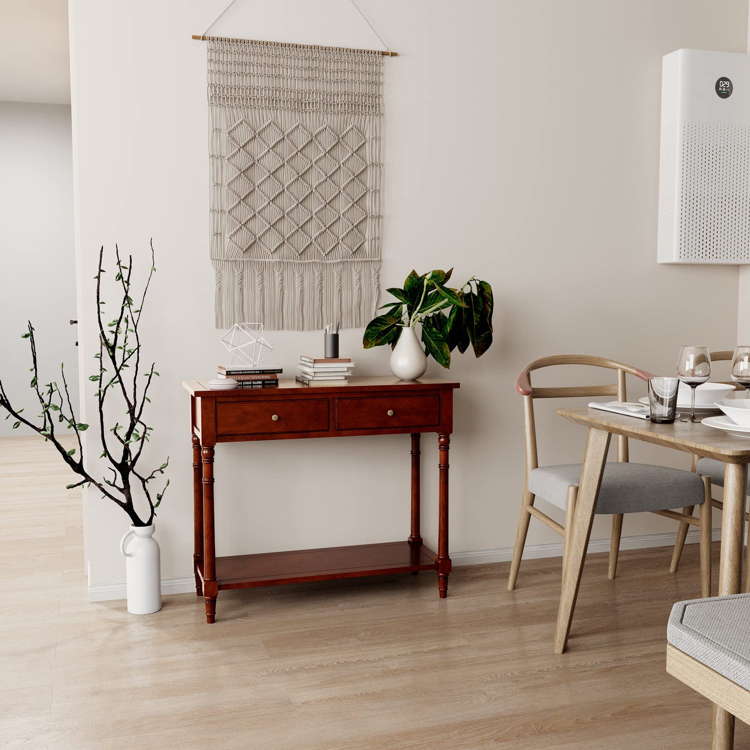 JESONVID Solid Wood Console Table with 2 Drawers, 2-Tier 35.4" X 30" Accent Sofa Table with Multilayer Storage Shelf Rustic Hall Entryway Tables for Living Room Home Office-Brown