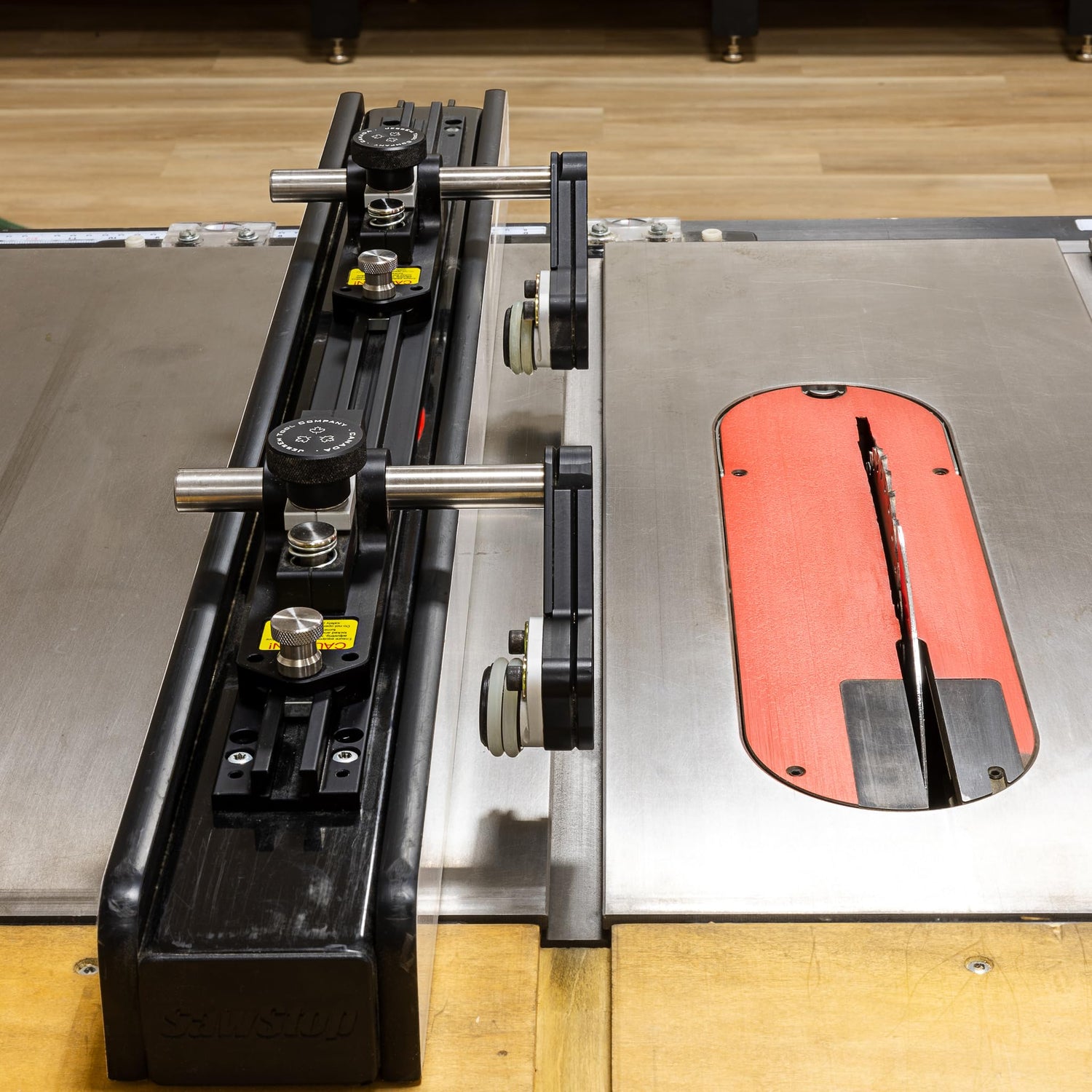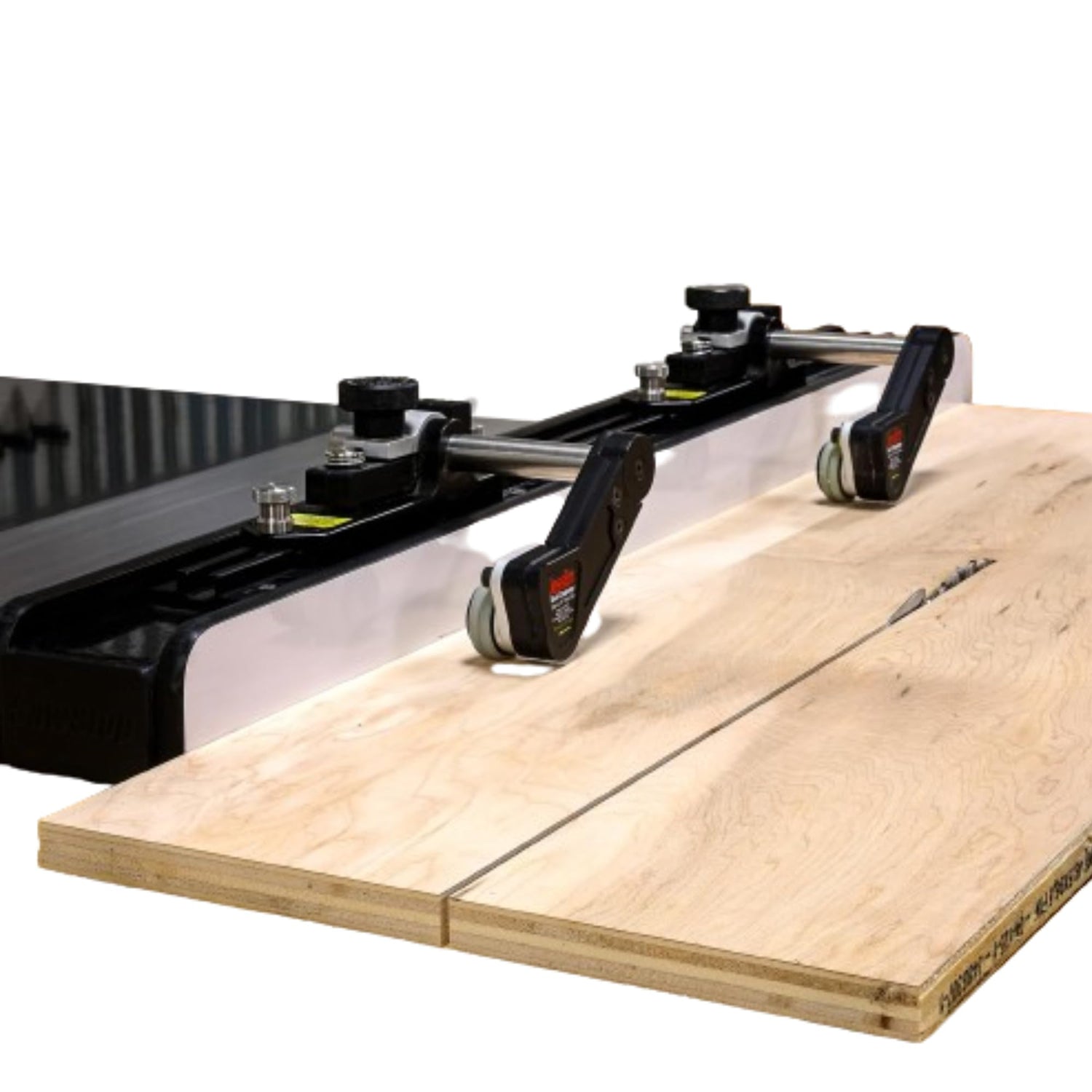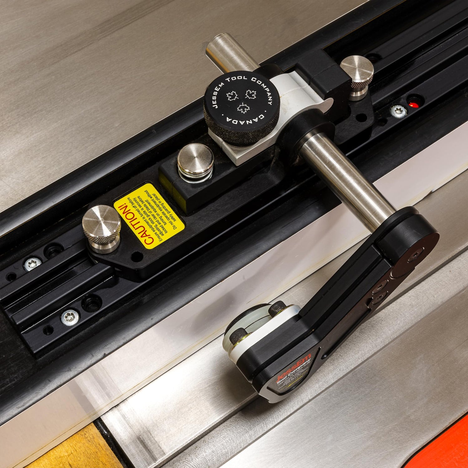 Details: The JessEm Clear-Cut TS Stock Guides for your table saw offer superior control on your workpiece by securely holding it in position to achieve safer, smoother, and more precise cuts. The unique guide rollers mounted on a 5-degree angle effectively steering your stock towards your fence. This angle causes the roller to hold with more force if the wood tries to move against the direction of the feed. Under spring pressure, the roller arms ensure your work is held firmly in place. Rollers are fitted with one way roller bearings to ensure each roller spins in the direction of the feed to prevent kickback. Fast and Easy Set Up The guides lock into position along the track with a twist of the anodized aluminum clamping knobs. Grip force urethane rollers hold your stock securely in position. When not in use they tuck away in behind the surface of your fence. Perfect for Boards or Large Panels The guides have 3-1/8" of total vertical travel and can accommodate a maximum stock thickness of 13/16" above the mounting surface when mounted to the T-track. The Clear-Cut TS Guides give you complete control of your stock even when routing wide boards or large panels. The dual action of the guides will pull your work tight to the fence. Material and Construction The guides are CNC-machined from 6000 series aluminum and anodized for appearance and durability. The roller axels are machined from cold rolled steel and case hardened for durability, while rollers are designed from wear-resistant acetal resin. Traction tires are molded out of urethane for long life and superior grip.