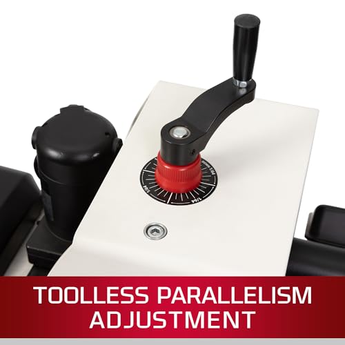 - Conveyor bed parallelism is easily adjusted by turning the dial on the outside of the bed--no tools required