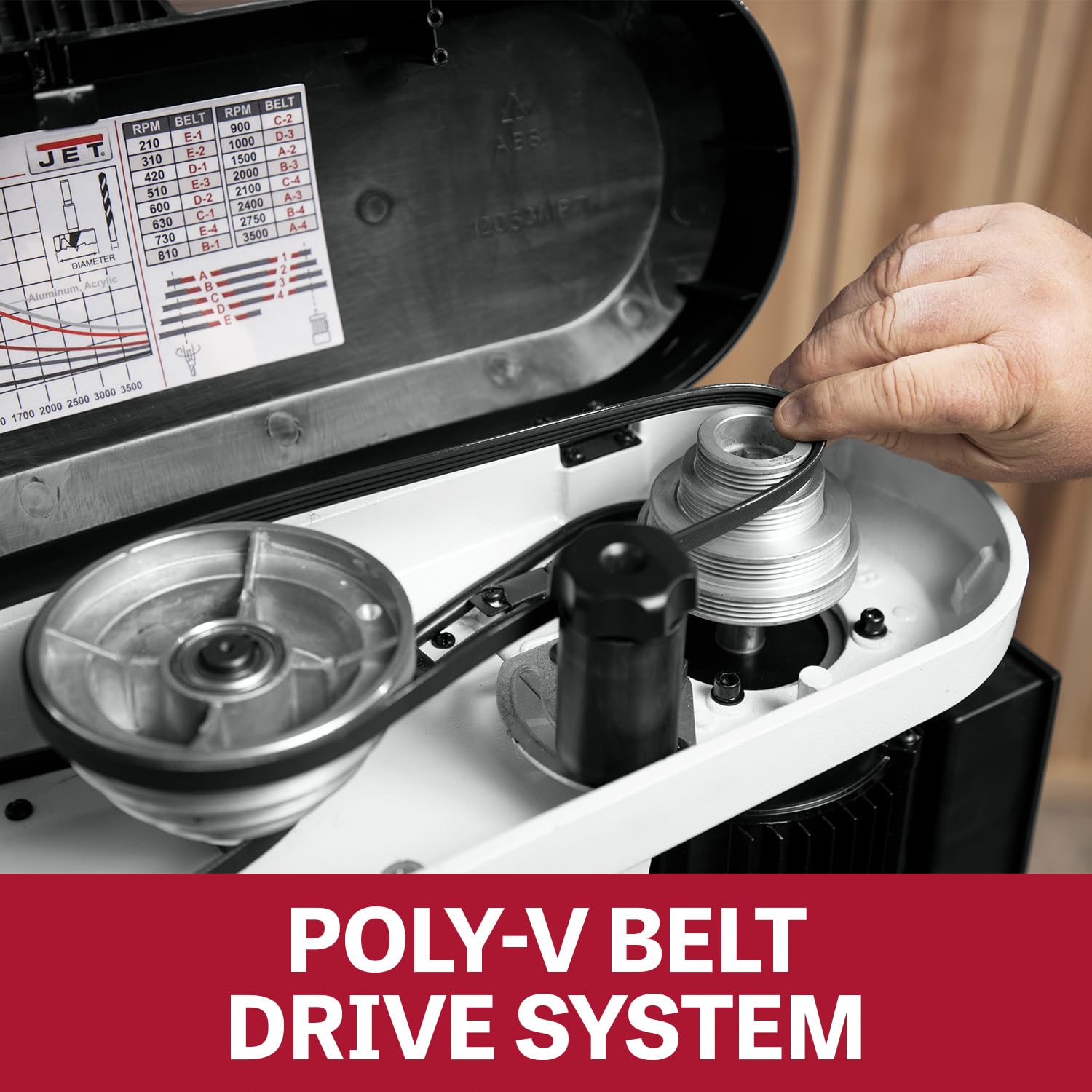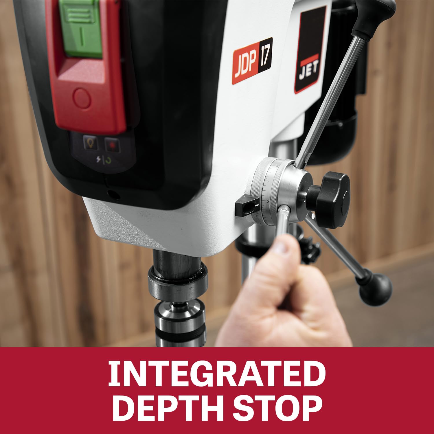 Details: Introducing the JET JDP-17, 17” Drill Press. From a full 5” of spindle travel, to the sturdy cast iron head with a poly v-belt drive system, this drill press is designed to perform. This drill press also features a long-lasting, built-in LED work light to provide direct lighting while reducing shadows. A large 14" x 19" work table provides plenty of support with an edge designed for easy clamping.