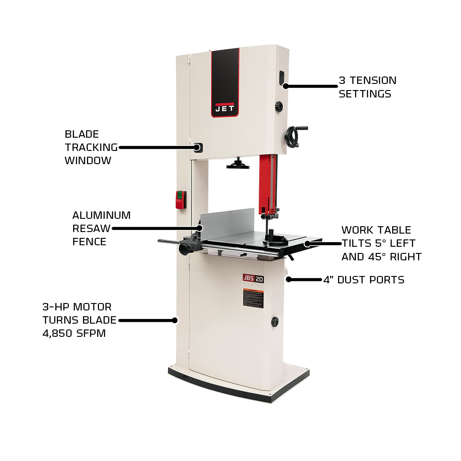 JET 20-Inch Woodworking Bandsaw, 3 HP, 1Ph 230V (Model JWBS-20-3)