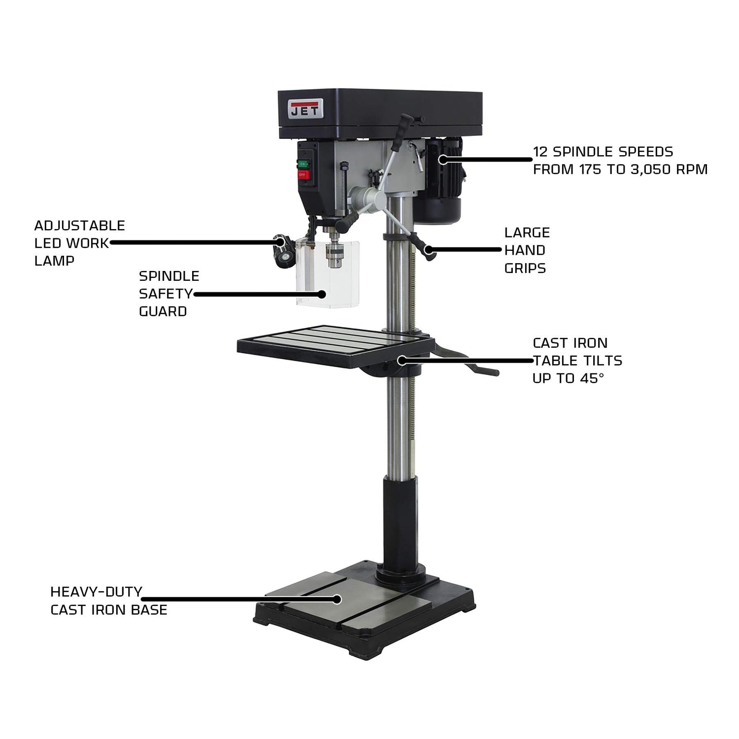 Accuracy, stability, and versatility are the benchmark features of the JET 22" drill presses. This high quality line of JET drill presses offer a greater range in spindle speeds than other machines of this class. JET backs their machines with the industry-leading Two-Year Warranty.