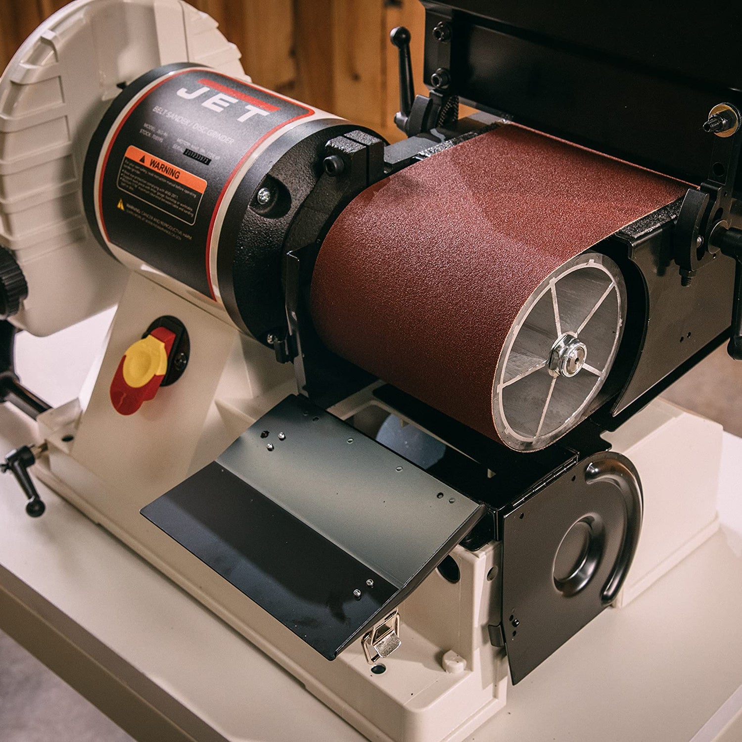 JET is a favorite with woodworkers because of power, precision, and quality. Mounted atop a rock-solid closed cabinet are a 6-inch wide belt sander as well as a 9-inch disc sander, each with an angle-capable work table and miter gauge slot--two slots, actually, on the disc sander table for cross-disc work as well as straight-on sanding. Jet took the quality a notch higher on this model by putting a graphite sheet on the belt platen, keeping the temperature down and extending belt life. Tracking is sometimes tricky with belt sanders, so we're glad to see the single tracking adjustment knob and the quick-lock handle that keeps the belt from wandering. Changing belts is a snap--just release the belt tension lever. The 4-inch dust port accepts a standard dust-collection system hose and draws from both sanders, keeping the mess out of your shop and your lungs. The 3/4-horsepower motor runs the belt sander at 2258 rpm and the disc at 1725 rpm, enough to handle big jobs without bogging down. There's even space in the cabinet to store abrasives.--Kris Jensen-Van Heste