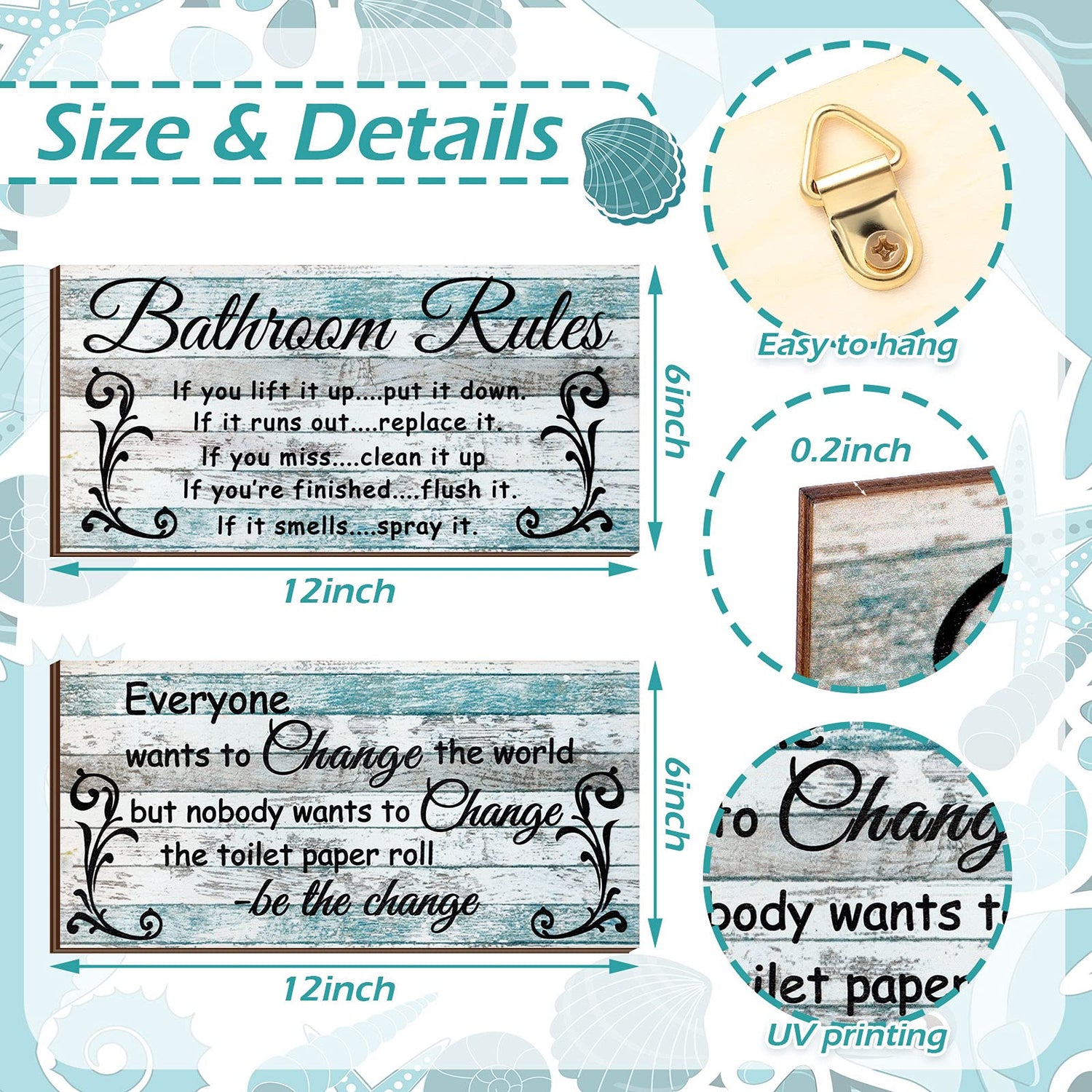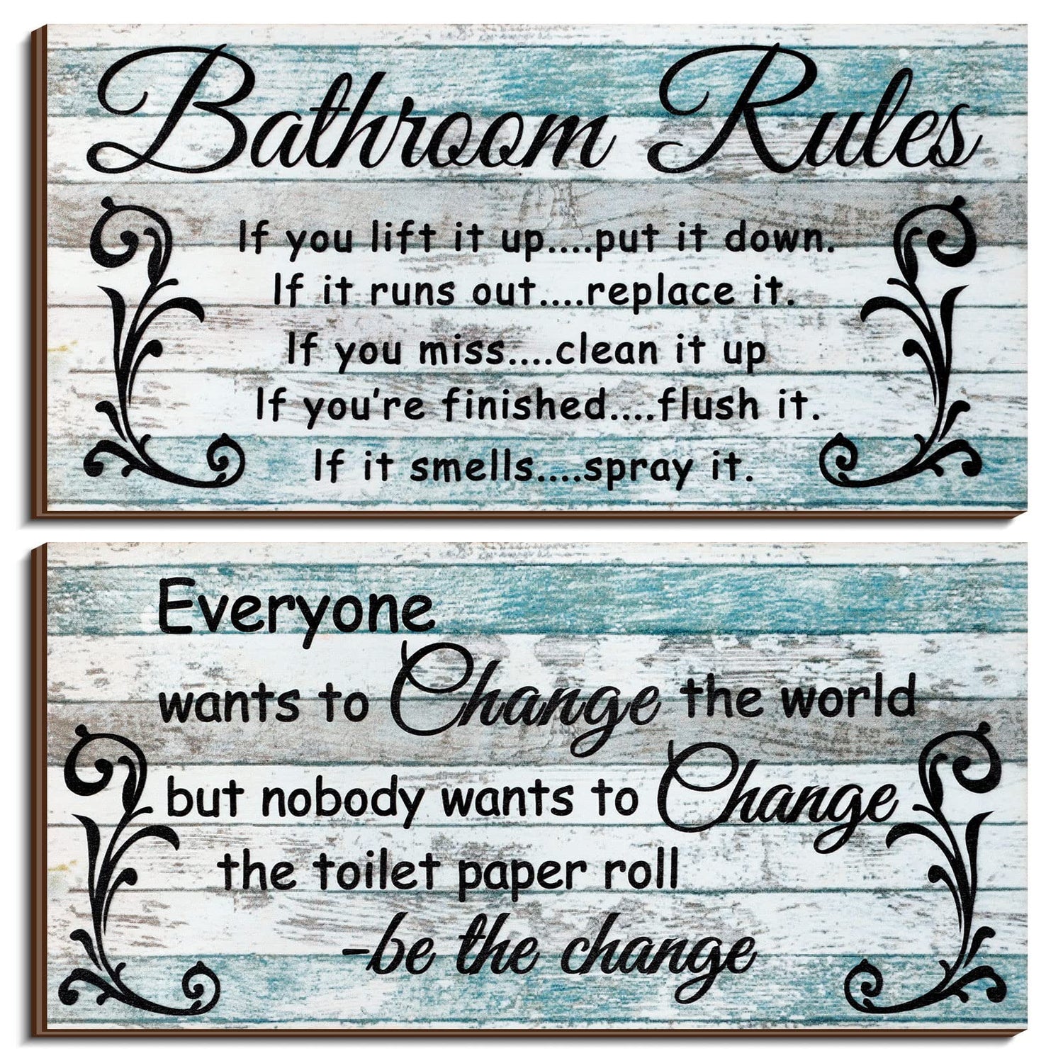 - What you will get: the package contains 2 pieces of funny bathroom signs and swivel loop hangers, each of them measures approx. 12 x 6 x 0.2 inches, a suitable size for you to decorate your home, and there are bathroom rules and to be change on it, all of them are bathroom themes, to make your visitors feel warm and comfortable