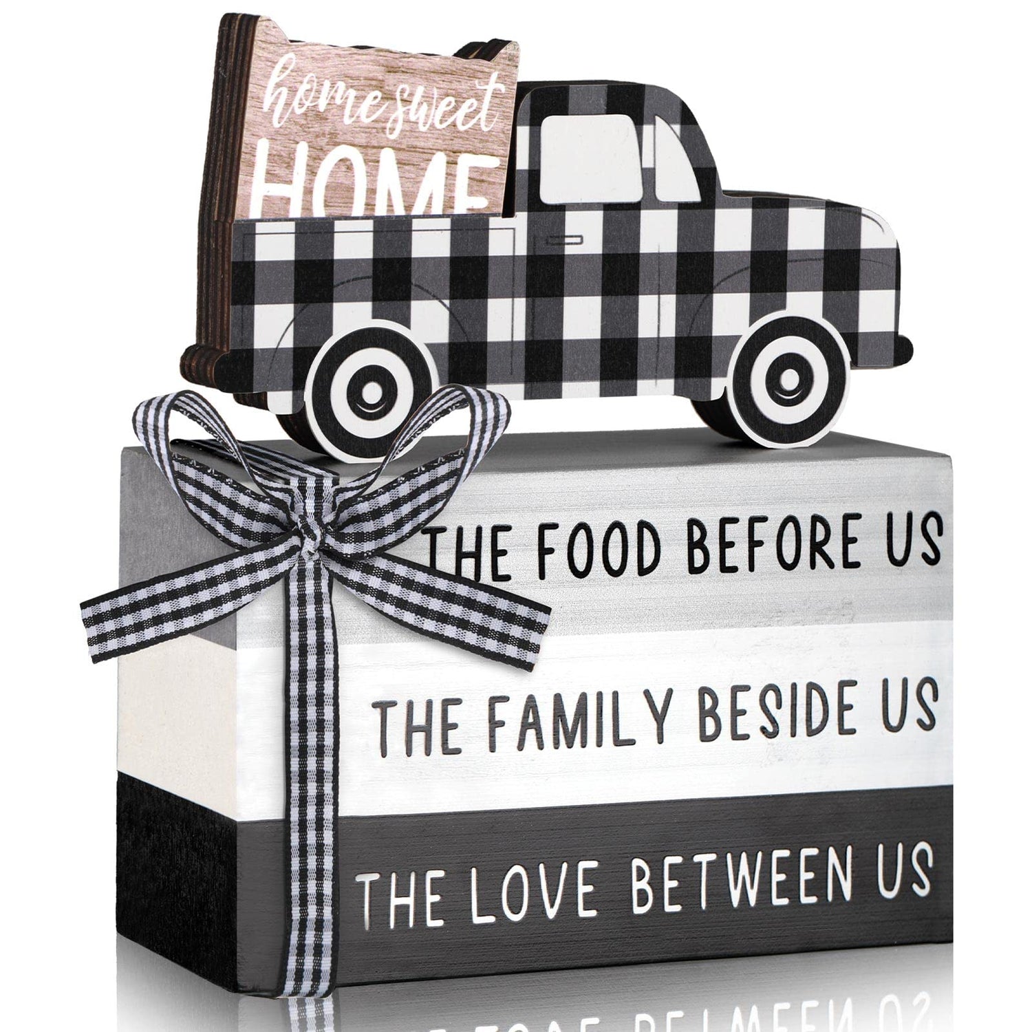 Jetec 4 Pcs Farmhouse Wooden Tabletop Decor Farmhouse Rustic Tiered Tray Decor Home Sweet Home Centerpiece Black and White Truck Buffalo Plaid Tabletop Sign for Kitchen Shelf Desk Decoration