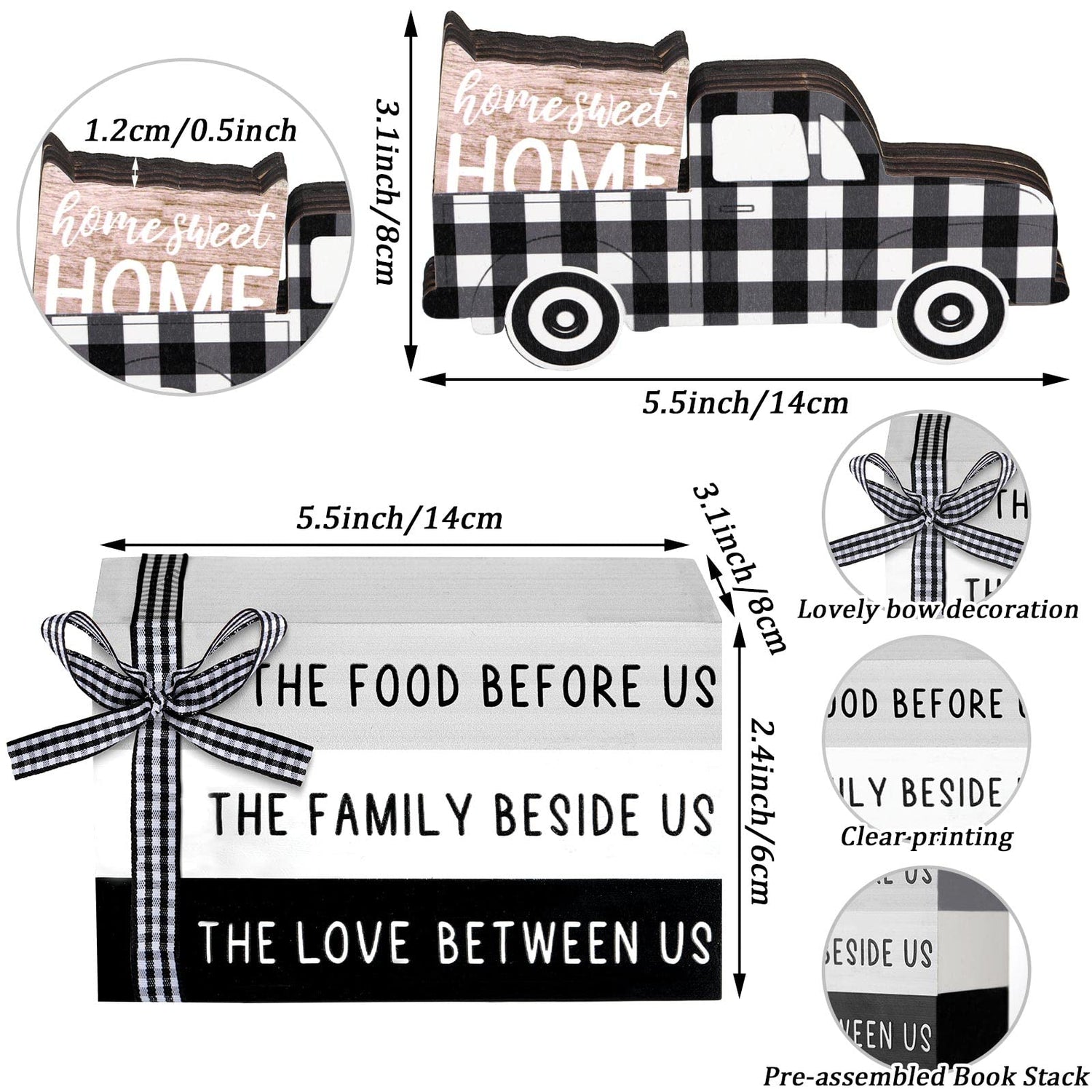 - Description of material and size: you will receive 4 pieces of wood decors in different styles, 1 piece of black and white pickup truck ornament and 3 pieces of wood books of the same size but different styles, which are tied together with ropes and bows; The truck shaped decor is approx. 5.5 x 3.1 x 0.5 inches and the book shaped decor is about 5.5 x 3.1 x 2.4 inches