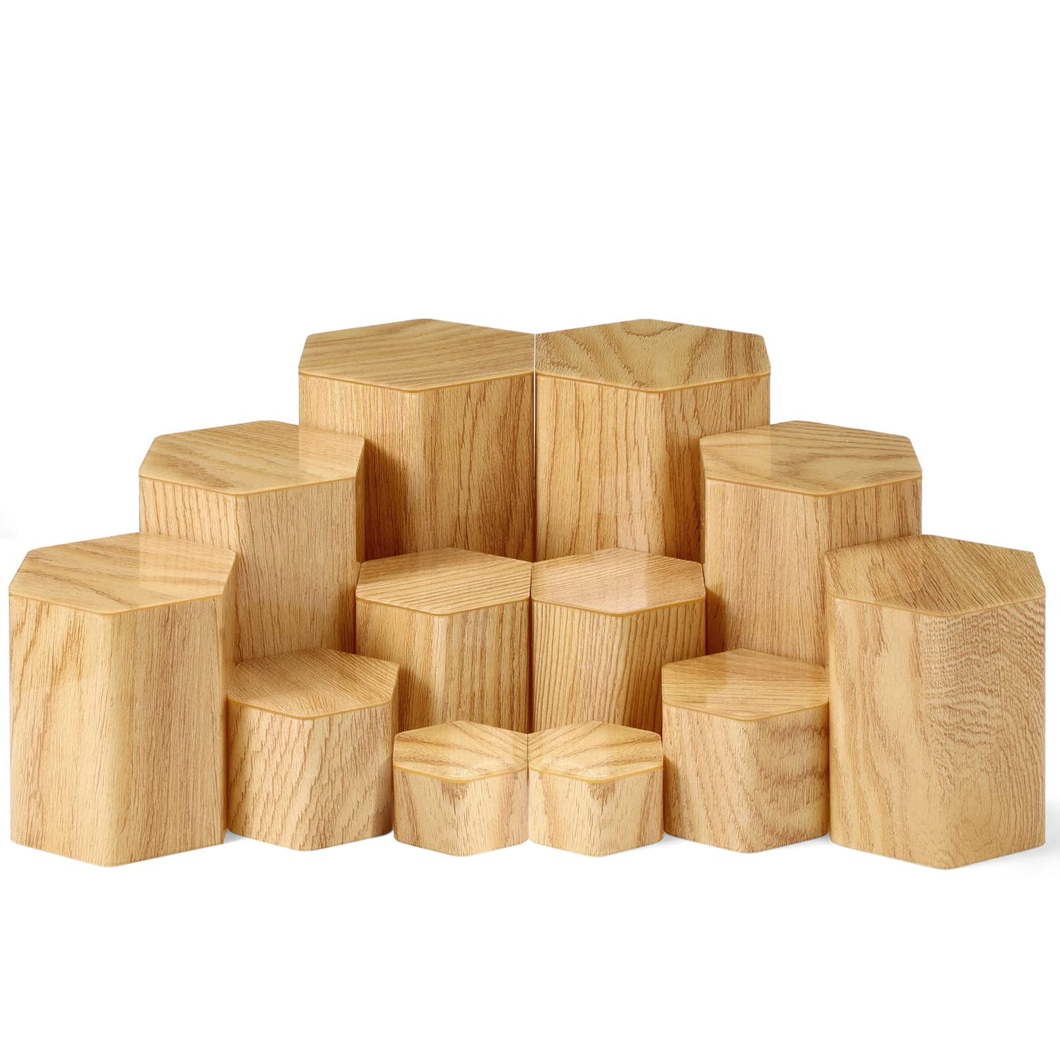 Jetec Hexagonal Jewelry Display Risers Hexagonal Market Display Risers Stands Acrylic Showcase Acrylic Stand for Jewelry Model Figures Decoration, 6 Sizes(Woodgrain,12 Pieces)