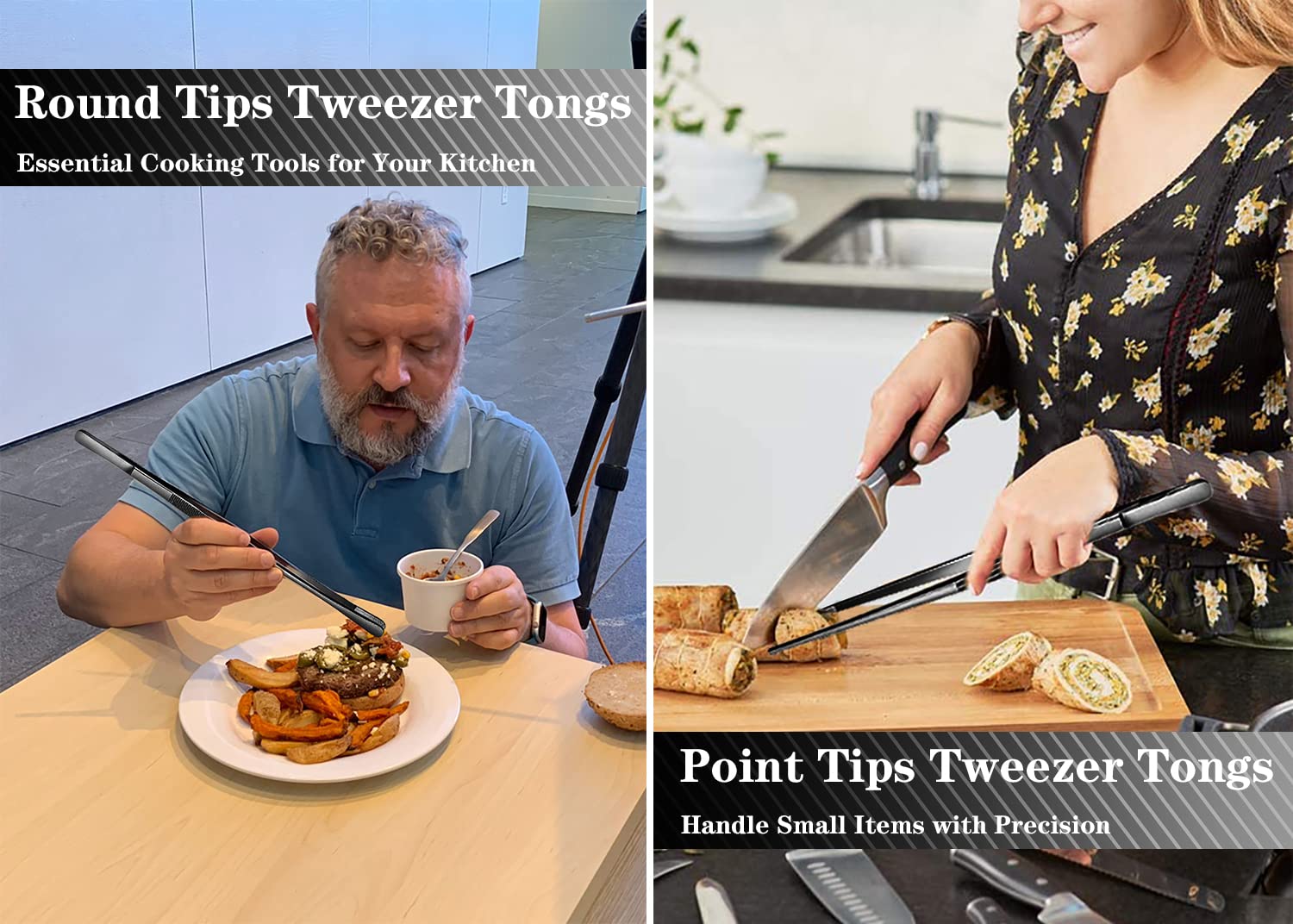 - PACKAGE CONTENT - Each packet purchase include 2 types 12-inch black kitchen tweezers for cooking. The rounded tips tweezer is blunt enough to be safe to touch or even press, and holds the food securely, minimizing the risk of food slipping and sliding. The pointed tips tweezer have a fine-tipped design to help chefs create delicate dishes.