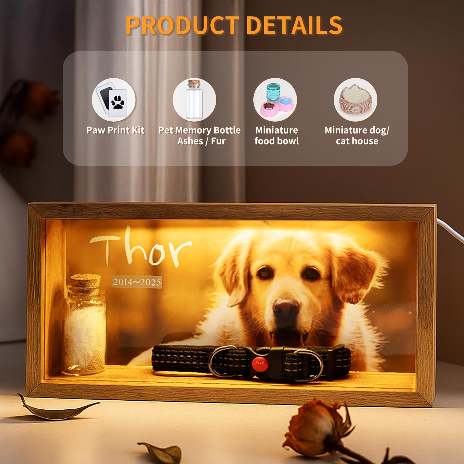 - This premium dog memorial shadow box provides the perfect way to honor your beloved pet. With ample display space for collars, photos and paw print keepsakes, it creates a beautiful tribute. The versatile design works as both a pet memorial and loss of dog sympathy gift