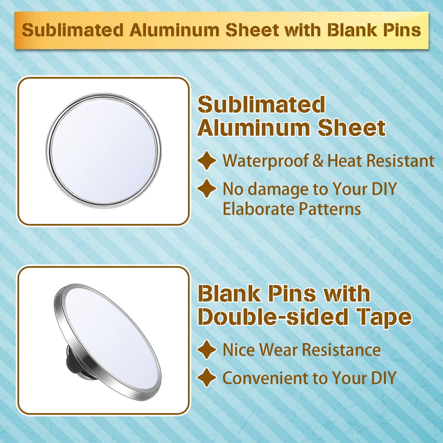 - Enough to Apply and Share: the package comes with 50 pieces of sublimation blank pins with double sided tape, and 50 pieces of sublimation aluminum sheet, a convenient DIY matching set to fit your badge making needs
