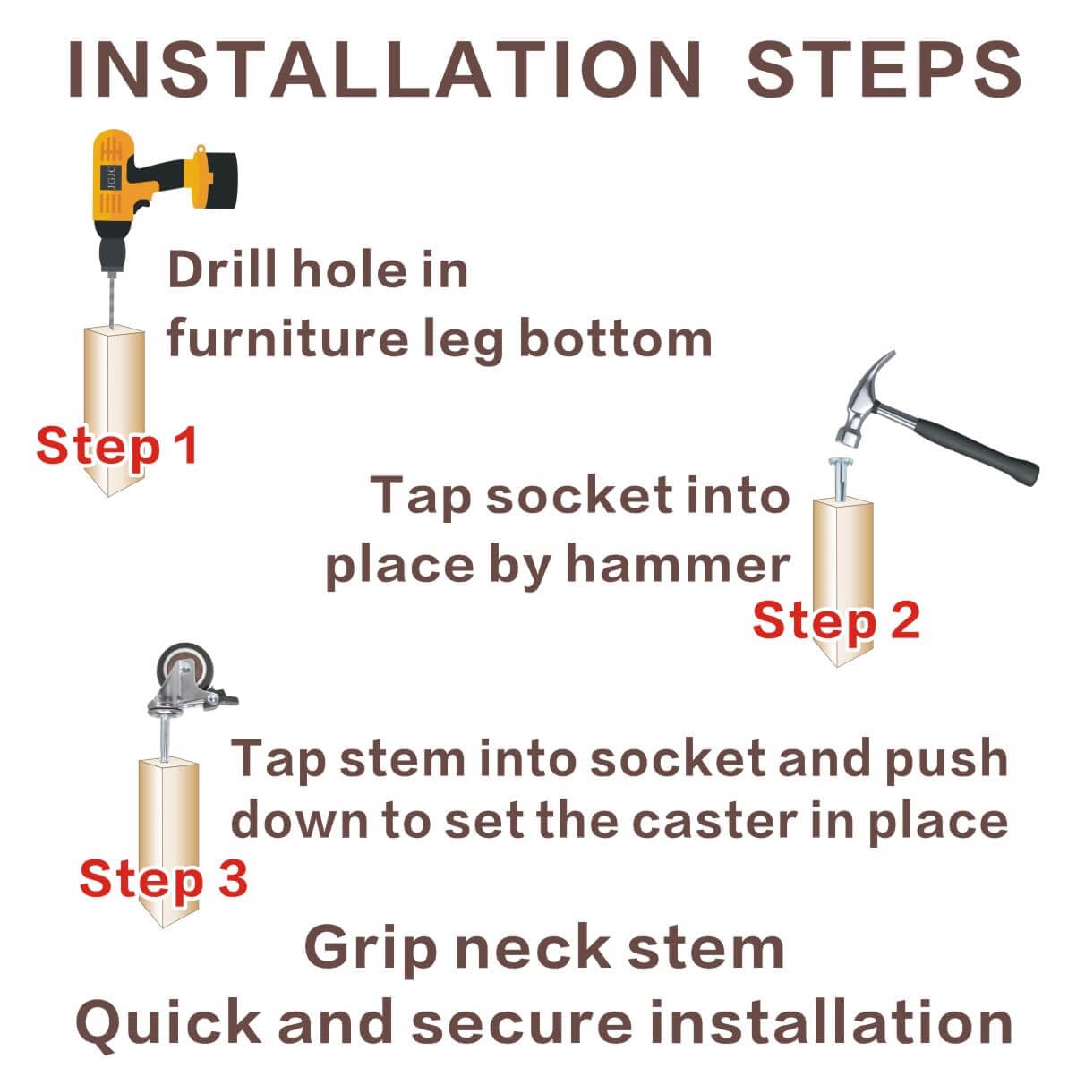 - SIMPLE & QUICK INSTALLATION -- JGJC rubber caster diameter is 2 inch, stem diameter 5/16" (0.3"), stem length 1-1/2" (1.5"), installation height 2-1/2" (2.45"), package includes 2 inch caster wheels sets 4 and 4 sockets to install easily. If there are no mounting holes, drill appropriate size holes, then knock the socket into wood legs, lastly tap the caster into the installed socket.