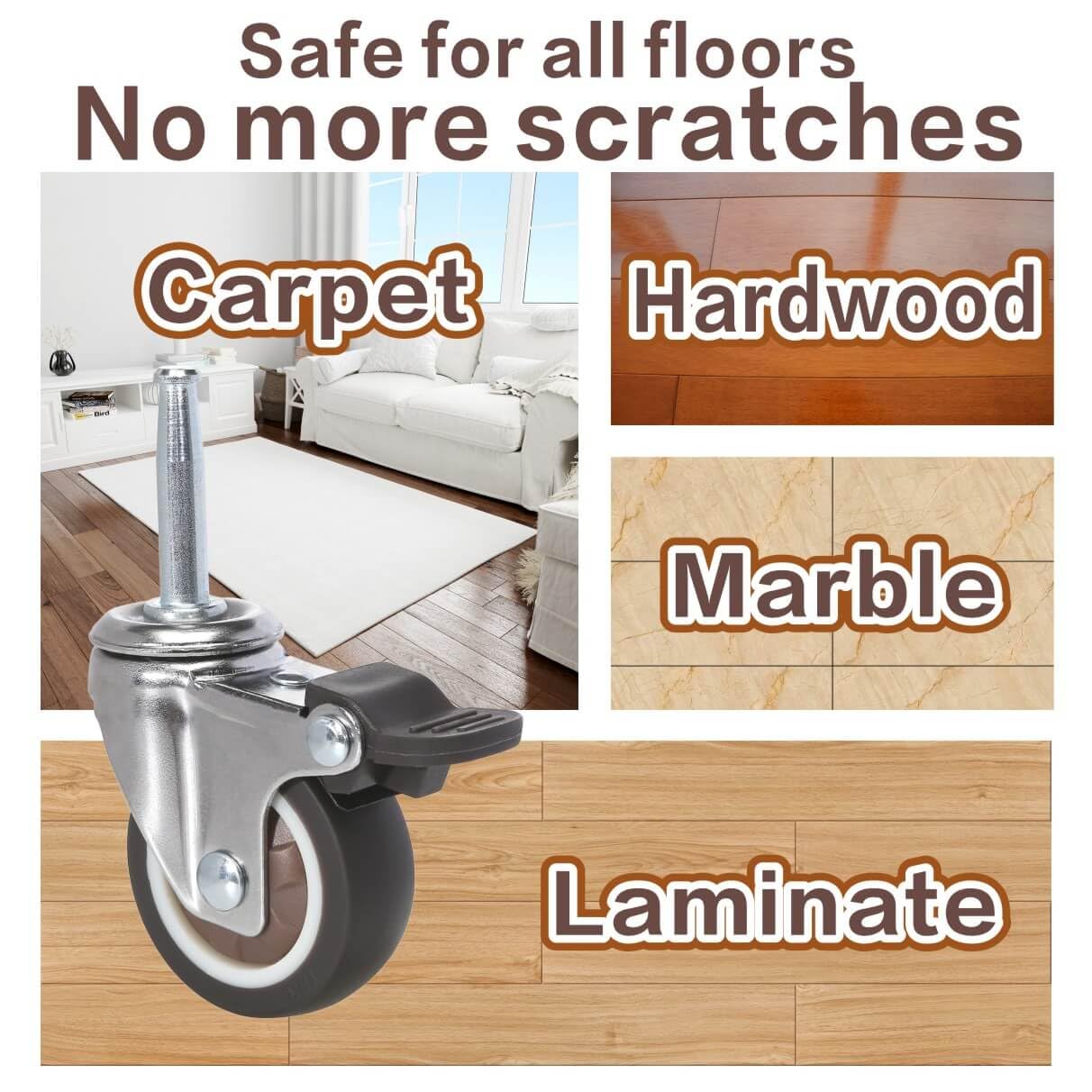 - QUIETER & SMOOTHER ROLLING -- JGJC 2 inch stem casters are made of premium thermoplastic rubber (TPR) material, which is no noise, shock-absorbing and more durable than other ordinary furniture caster wheels. By installing these rubber castor wheels, you can move furniture effortlessly on different floors or carpet, protect hardwood floors without any scratch.