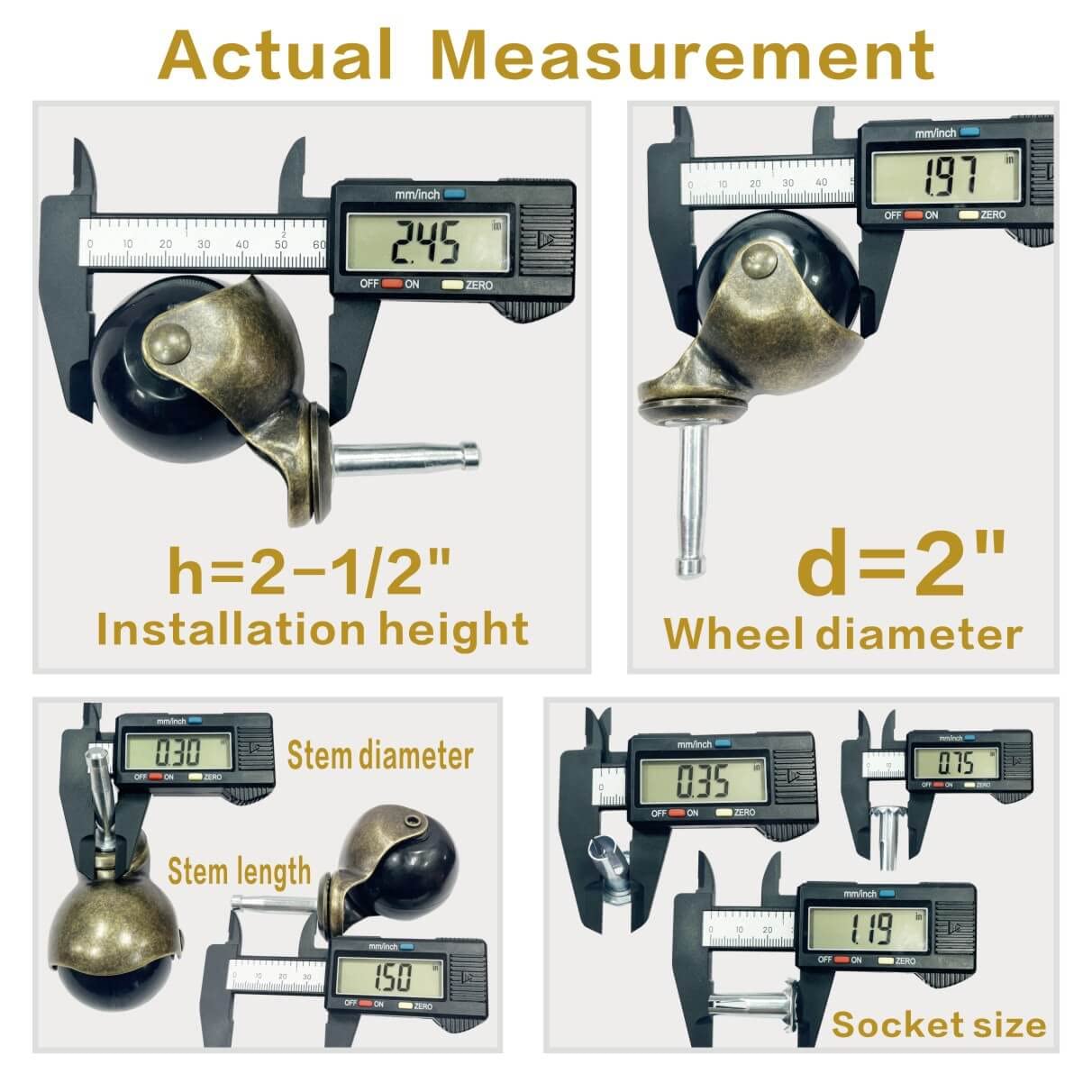 - DIMENSION & WHEEL SOCKETS -- JGJC antique ball caster wheel diameter is 2", stem diameter 5/16" (0.3"), stem length 1-1/2" (1.5"), installation height 2-1/2" (2.45"). Package includes 2 inch stem caster wheels 4 pack and 4 sockets. (Please check the specific sizes in figure 2 before order)