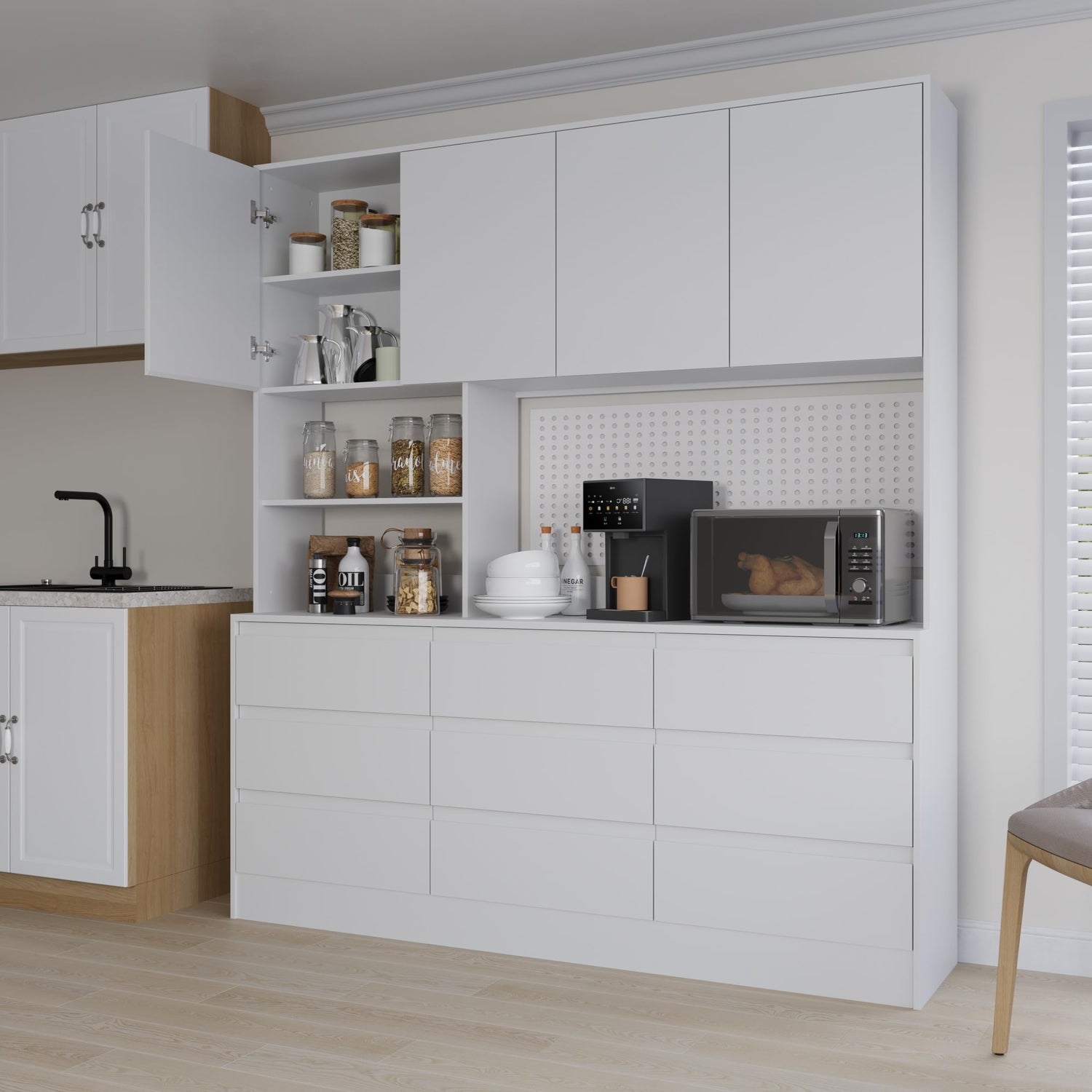 Jiaoun 78x71 LED Kitchen Pantry Cabinets with Microwave Stand,Socket,Large/Tall Kitchen Storage Cabinet with 6 Compartments and 9 Drawers,Duitable for Restaurants,Kitchens