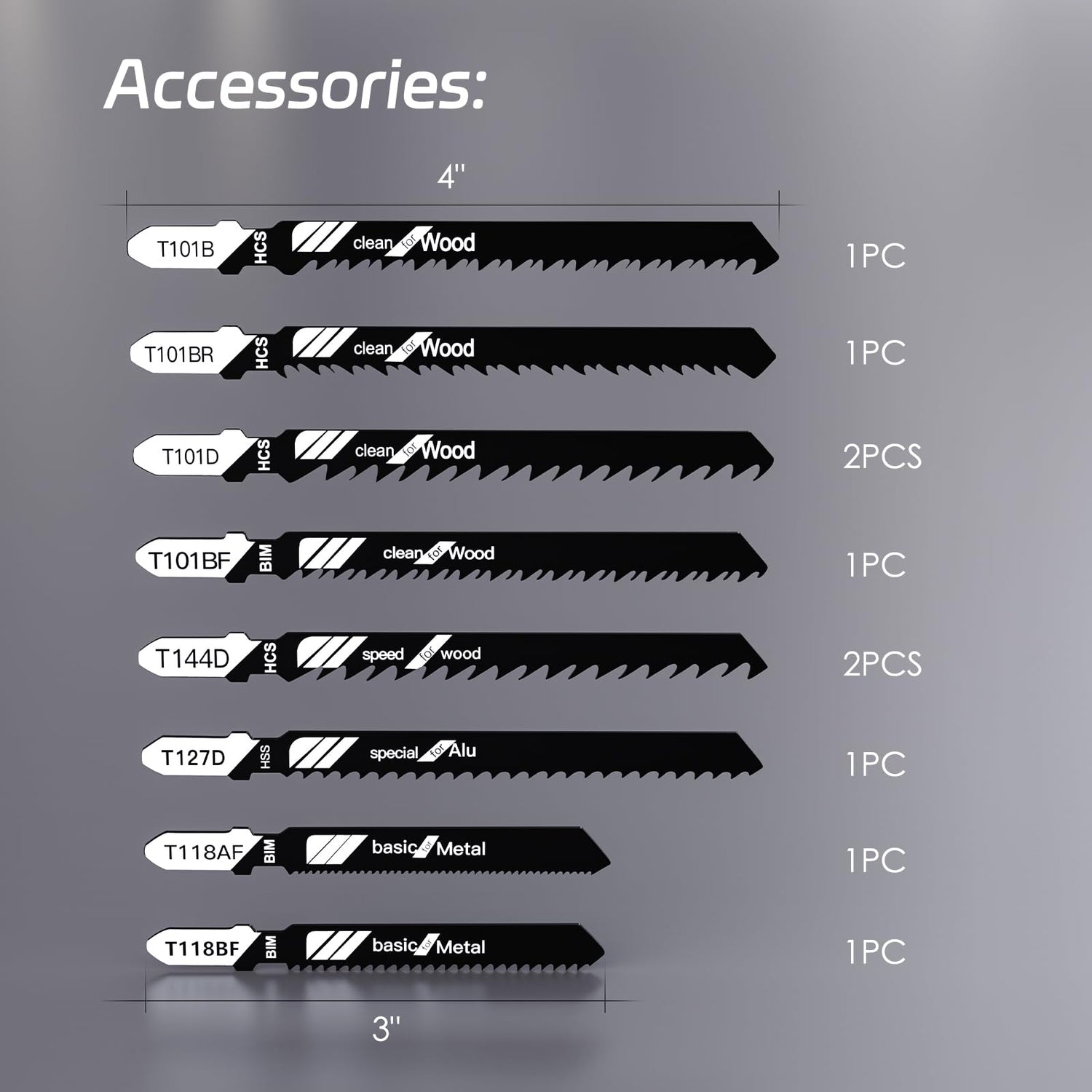 - 【Tool-Free Blade Clamp & 10 Blades Kit】Tool-Free Blade Clamp allows you to replace T-shank cordless jig saw blades faster and easier for your convenience. 10 T-shank blades of different TPIs are included for wood, PVC, metal and aluminum cutting. Parallel saw guide is included for guiding cuts precisely. Tool bag is included for carrying around. The power jigsaw is compact in size and light in weight for one-hand operation to reduce muscle fatigue.