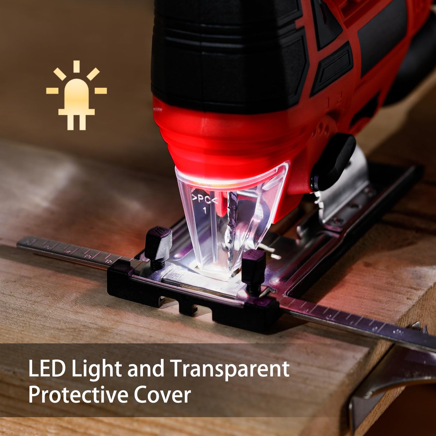 - 【Bright LED Light & Safety Switch】The built-in bright LED light on the jig saw tool is helpful to work in low light environment by illuminating work surfaces. Safety switch is designed to prevent accidental starting for your safety. Most critical parts of jigsaw are rubberized for less vibration and comfort operation. The rubberized grip allows you to hold the jig saw tightly and to reduce the slippery condition.