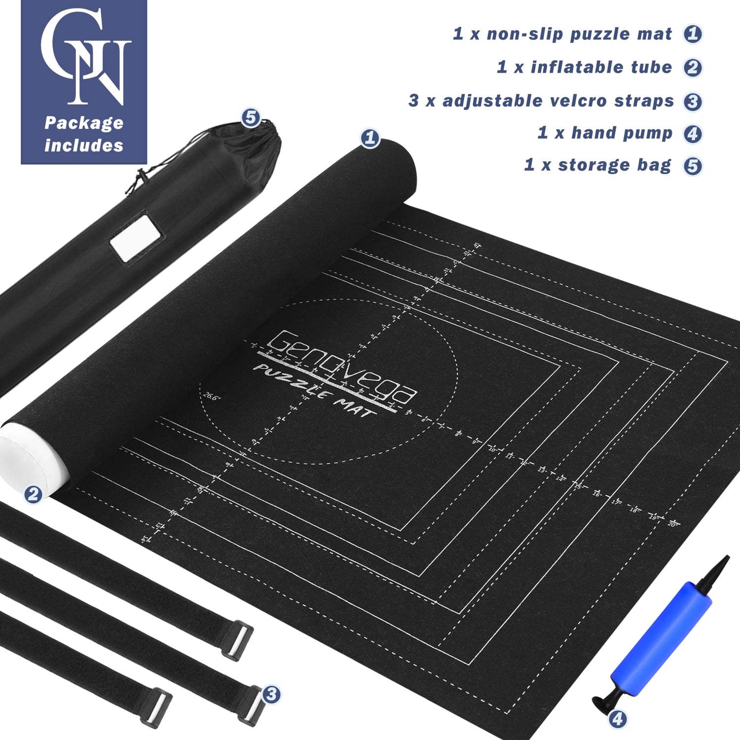 - Pakage Contents: 1* felt mat, 1*inflatable tube, 1*pump, 3*velcro straps, 1*storage bag. Make puzzling a breeze with Genovega Puzzle Mat Roll Up! The felt mat provides a smooth surface for easy puzzle assembly, and the included sorting tray keeps your pieces organized.