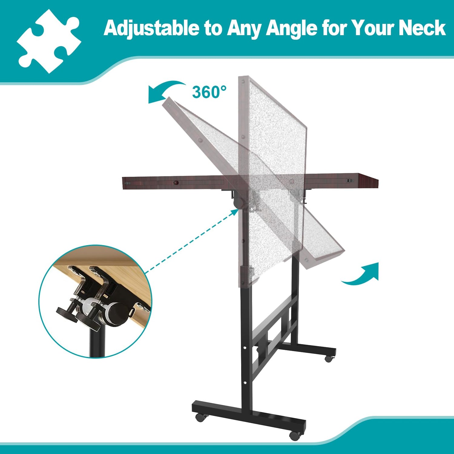 - Adjustable Puzzle Table - Our jigsaw puzzle table can be set up at 360 degrees angles and adjustable height from 25.6 in to 34.2 in. You may adjust the table to achieve your best comfort and avoid stiff neck or paining back, and fully enjoy the puzzle fun.