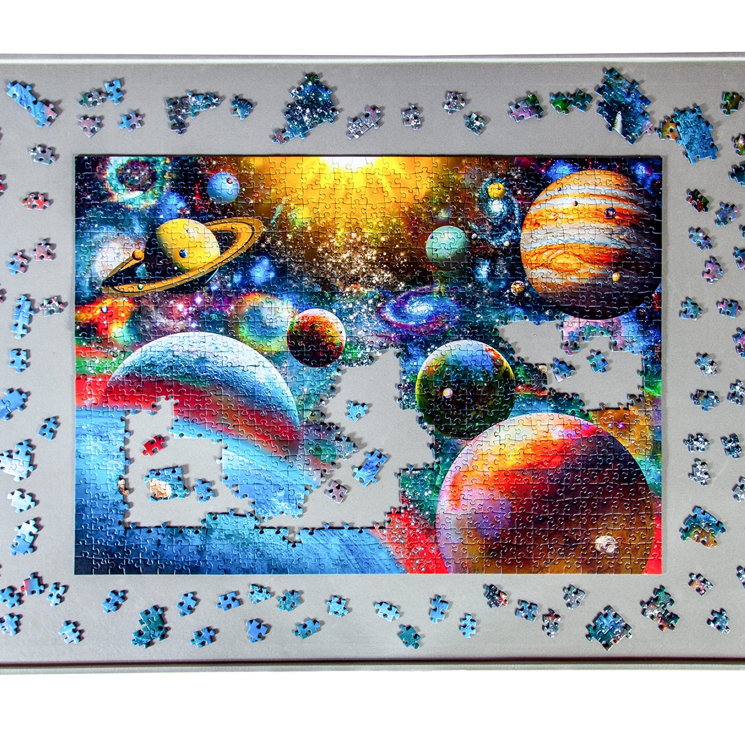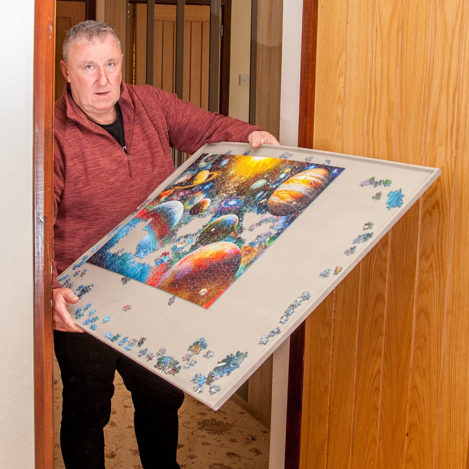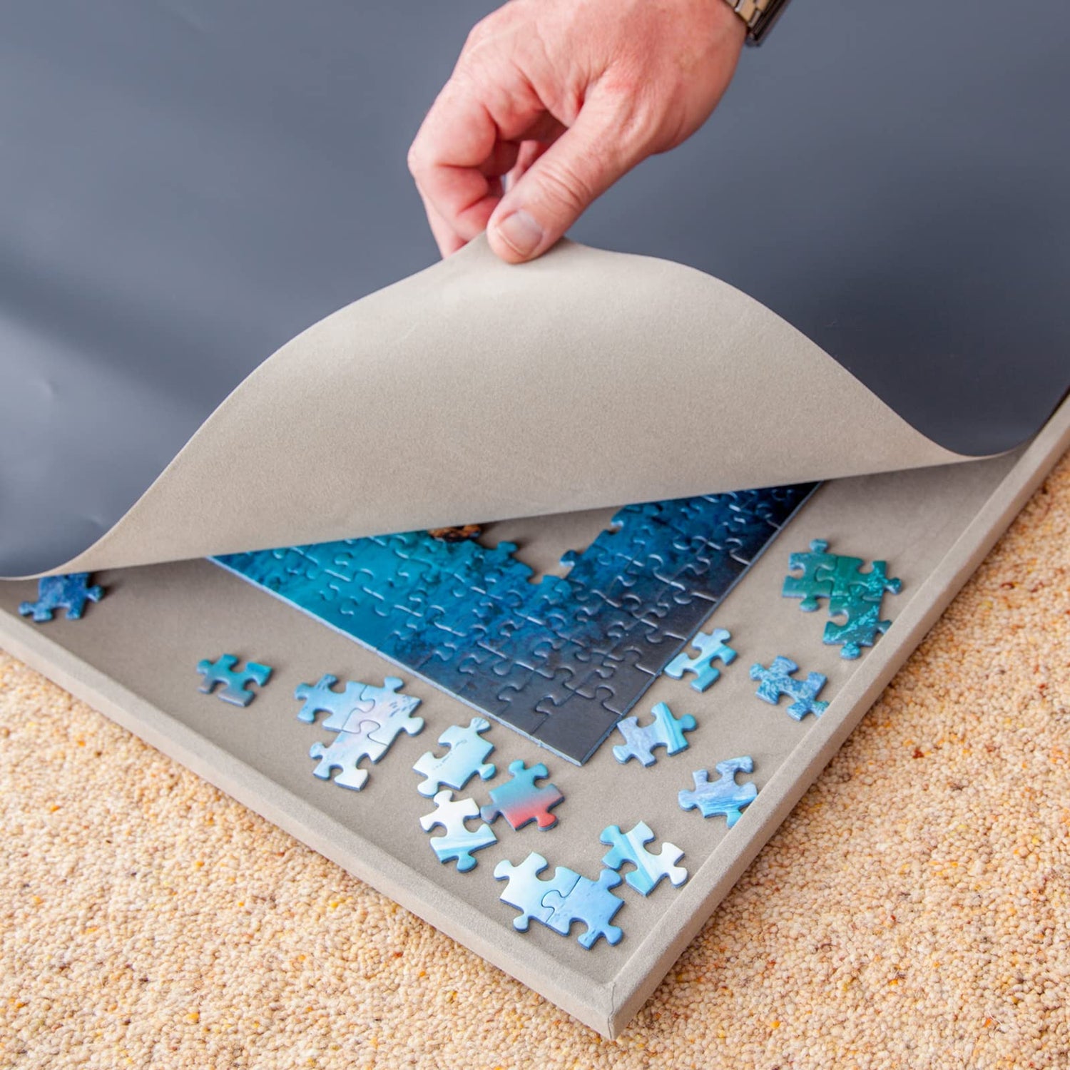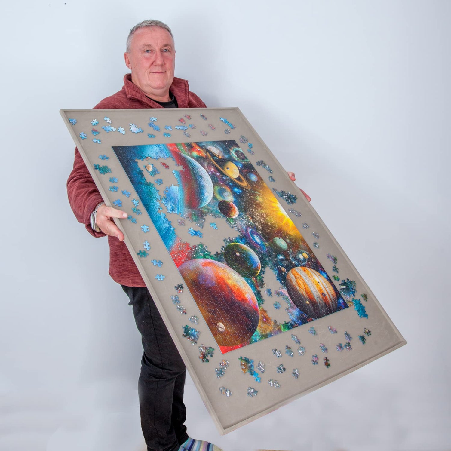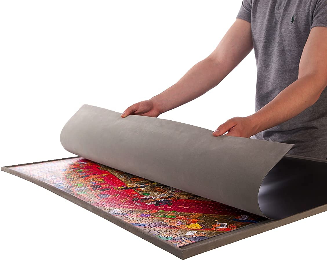 - A raised edge on the board guarantees no pieces fall off. The purpose-made cover ensures that the part-assembled puzzle is protected from pets, dust, and spillages.