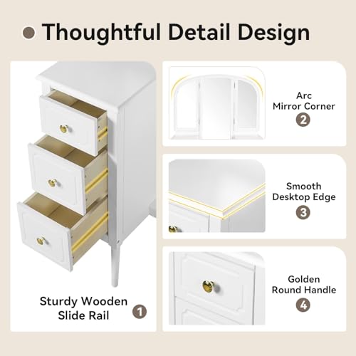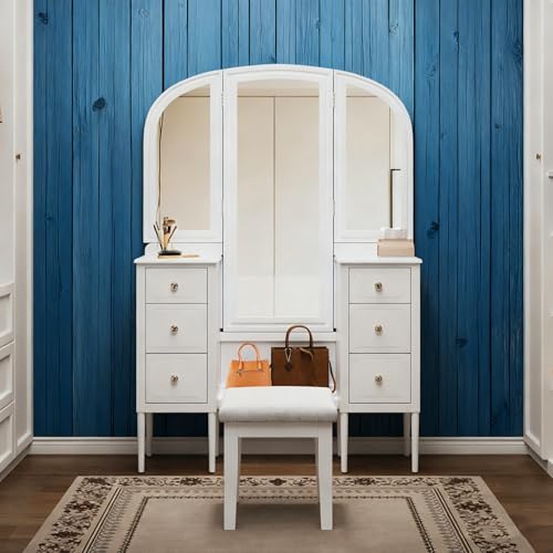 JIJIWANG 68.75H Antique Makeup Vanity Desk with Triple Mirror,6-Drawer Dressing Table Set Including Stool,Full Length Mirror for Bedroom Dressing Room,White