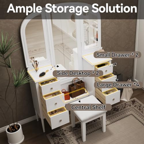 - Generous Storage Capacity: Stay organized with this makeup table’s ample storage. It includes 2 small drawers and 4 spacious drawers, providing plenty of space to keep your makeup, brushes, and beauty accessories neatly arranged. A middle shelf below the mirror offers additional storage for cosmetic bags, handbags, and larger items, keeping your vanity clutter-free and everything within easy reach.
