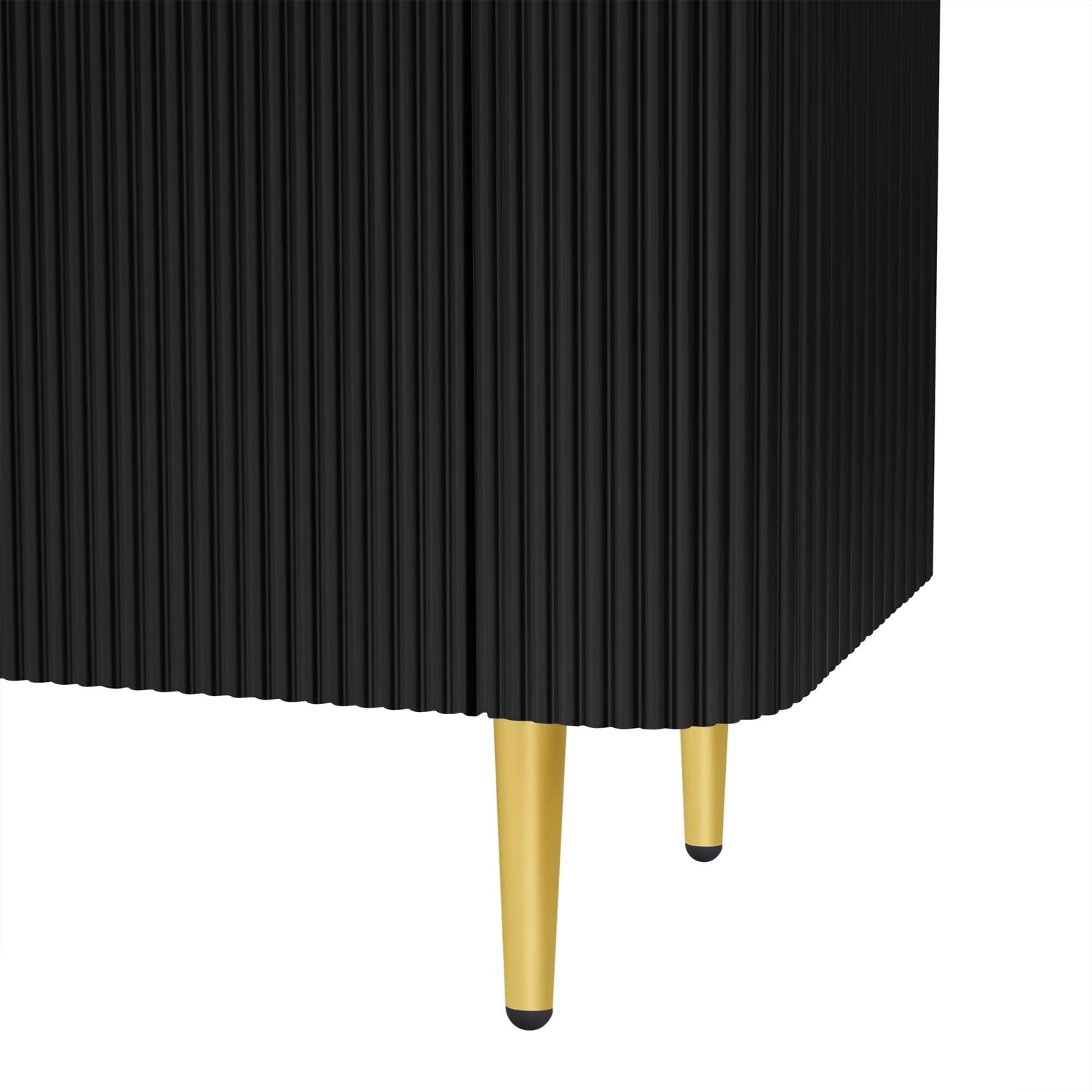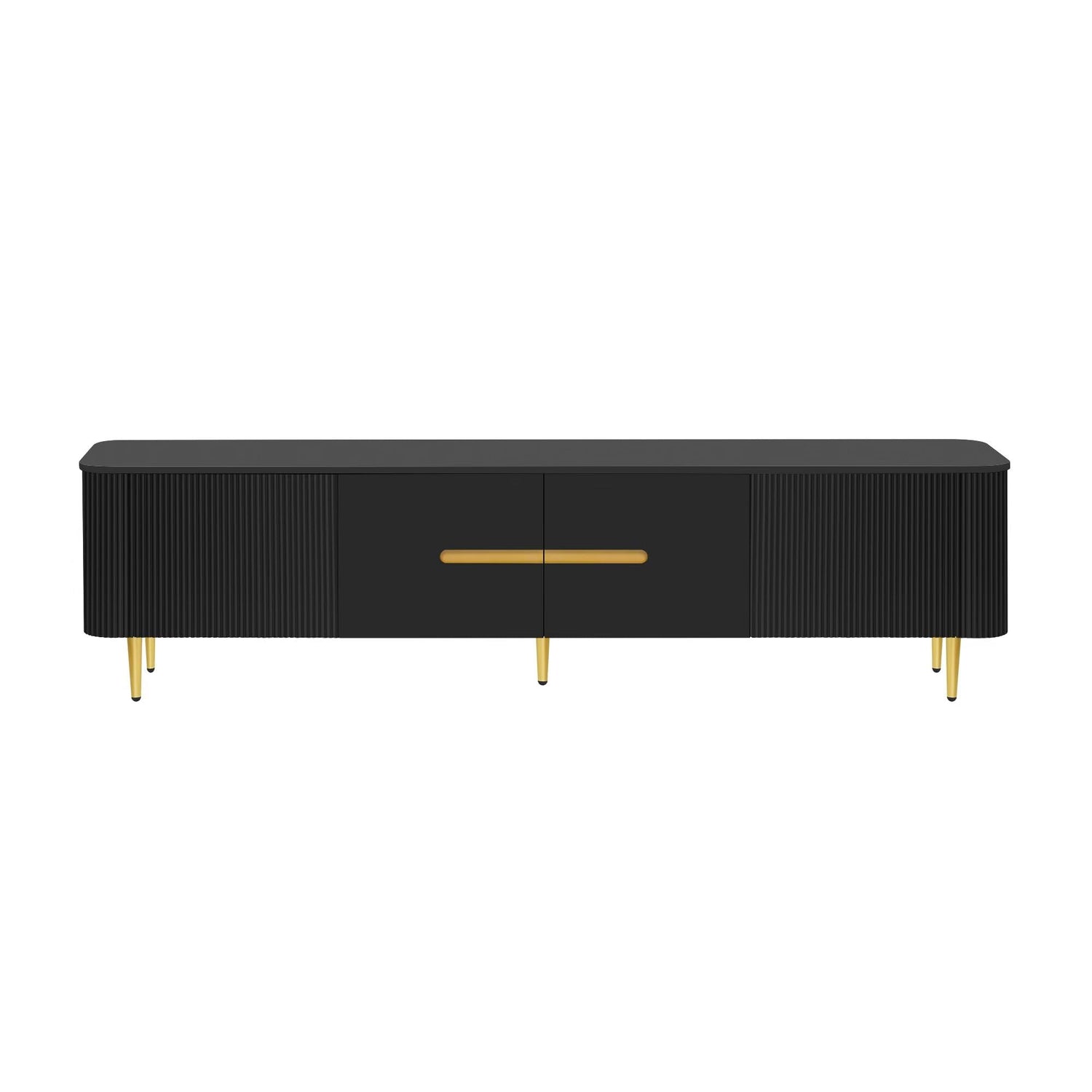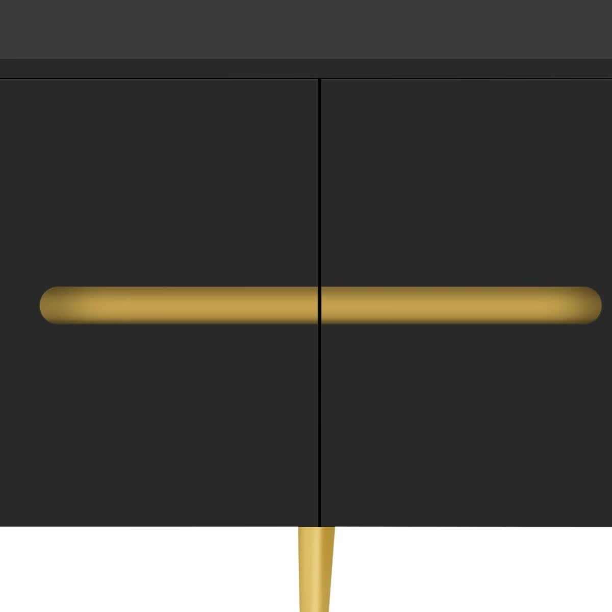 - Crafted from premium materials, this TV stand is designed to withstand the test of time while maintaining its aesthetic appeal. The use of high-quality MDF ensures a smooth, durable surface that resists warping and damage. And supporting the TV stand are five golden metal legs that provide both stability and a touch of luxury.