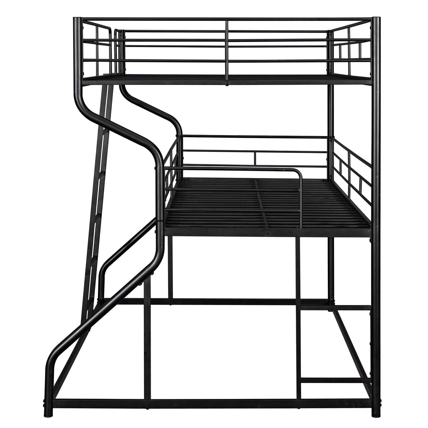 Details: Full XL Over Twin XL Over Queen Size Triple Bunk Bed with Long and Short Ladder, Unique Curved Metal Frame with Safety Guardrail, Industrial Style Triple Bunk Bed Frame, Black