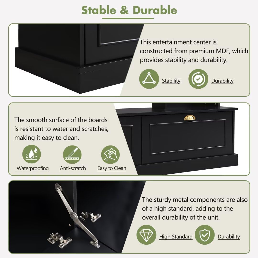 - 【Stable & Durable】This entertainment center is constructed from premium MDF, which provides stability and durability. The smooth surface of the boards is resistant to water and scratches, making it easy to clean. The sturdy metal components are also of a high standard, adding to the overall durability of the unit.