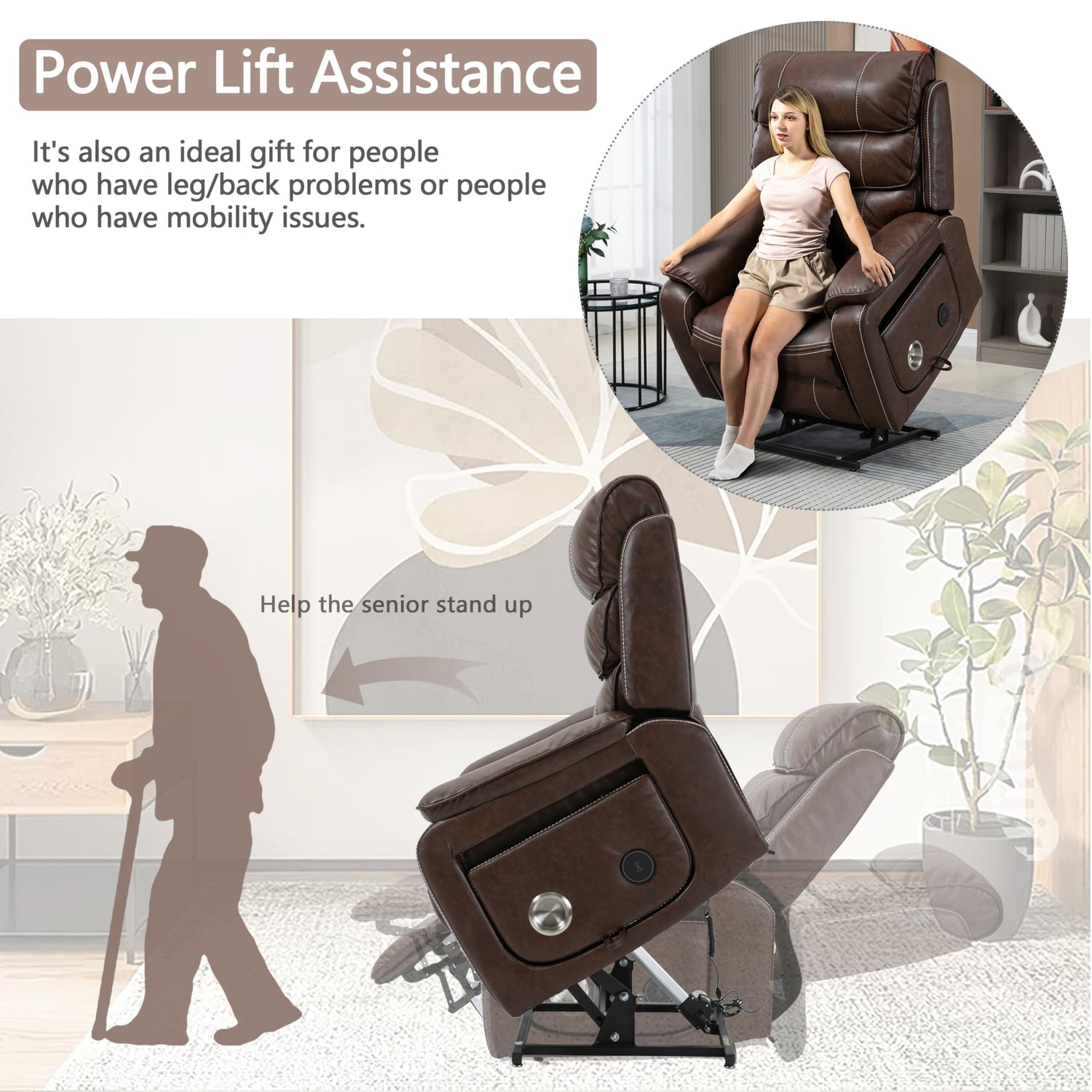 JIKFRIMA Power Lift Recliner Chair for Adults Elderly Lay Flat Leather Recliners with Massage Heating, Extended Footrest, Wireless Charging Device, USB Ports, Cup Holder, Lumbar Pillow, Up to 400LBS