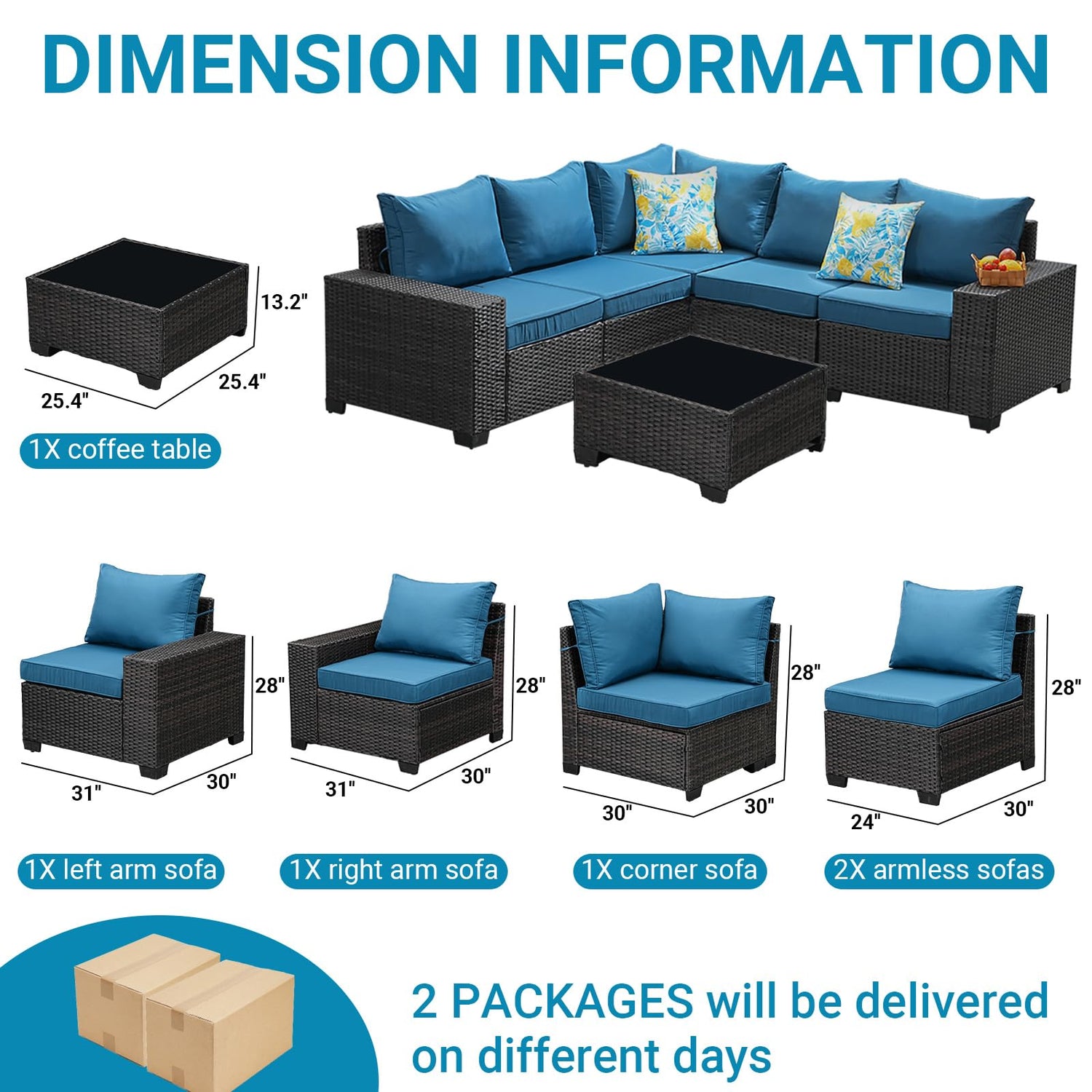 Jing's Villa 6-Piece Patio Furniture Set, All-Weather Outdoor Wicker Sectional Sofa with Cushions,Glass Table & Left and Right Armrest, Rattan Conversation Seating for Porch, Backyard,Peacock Blue
