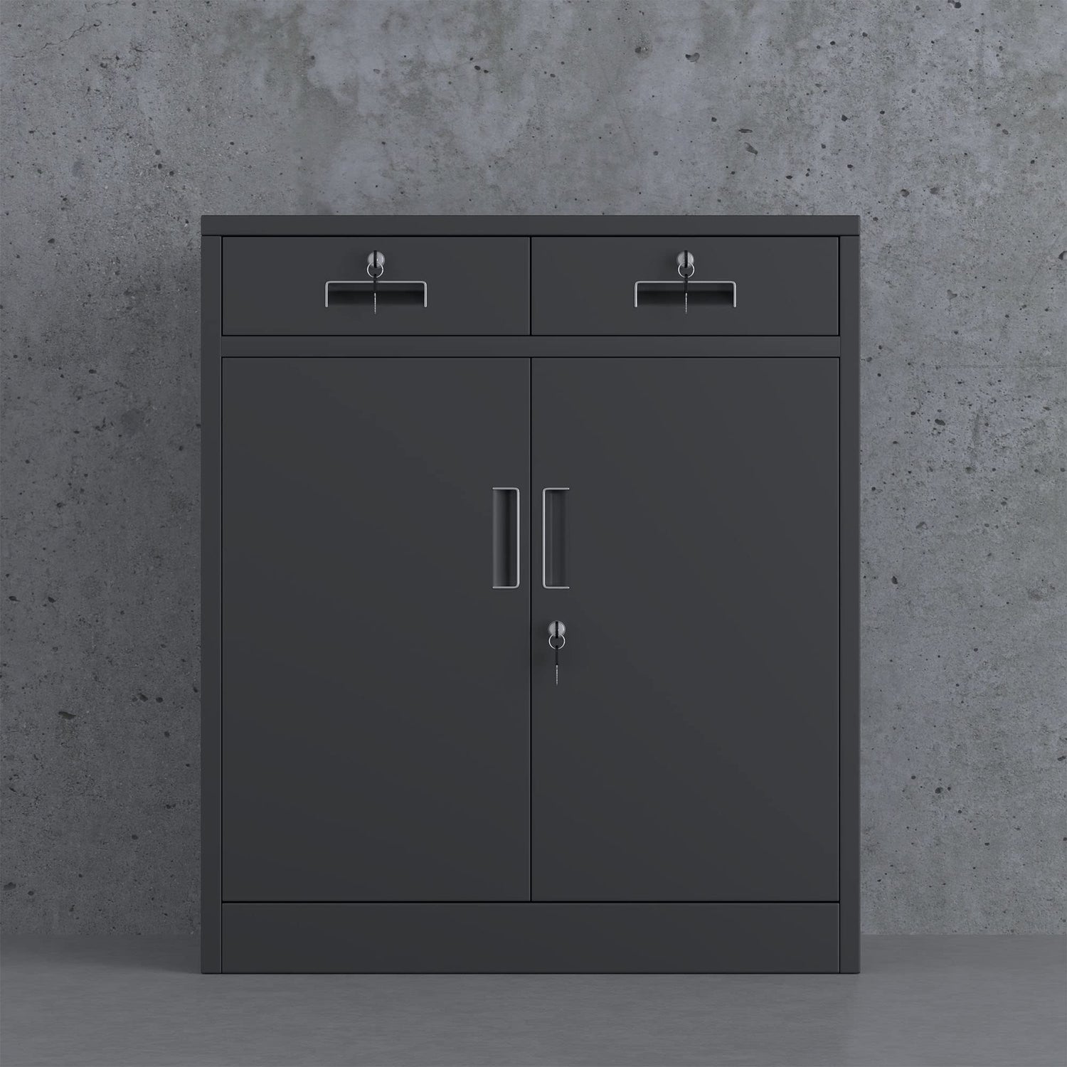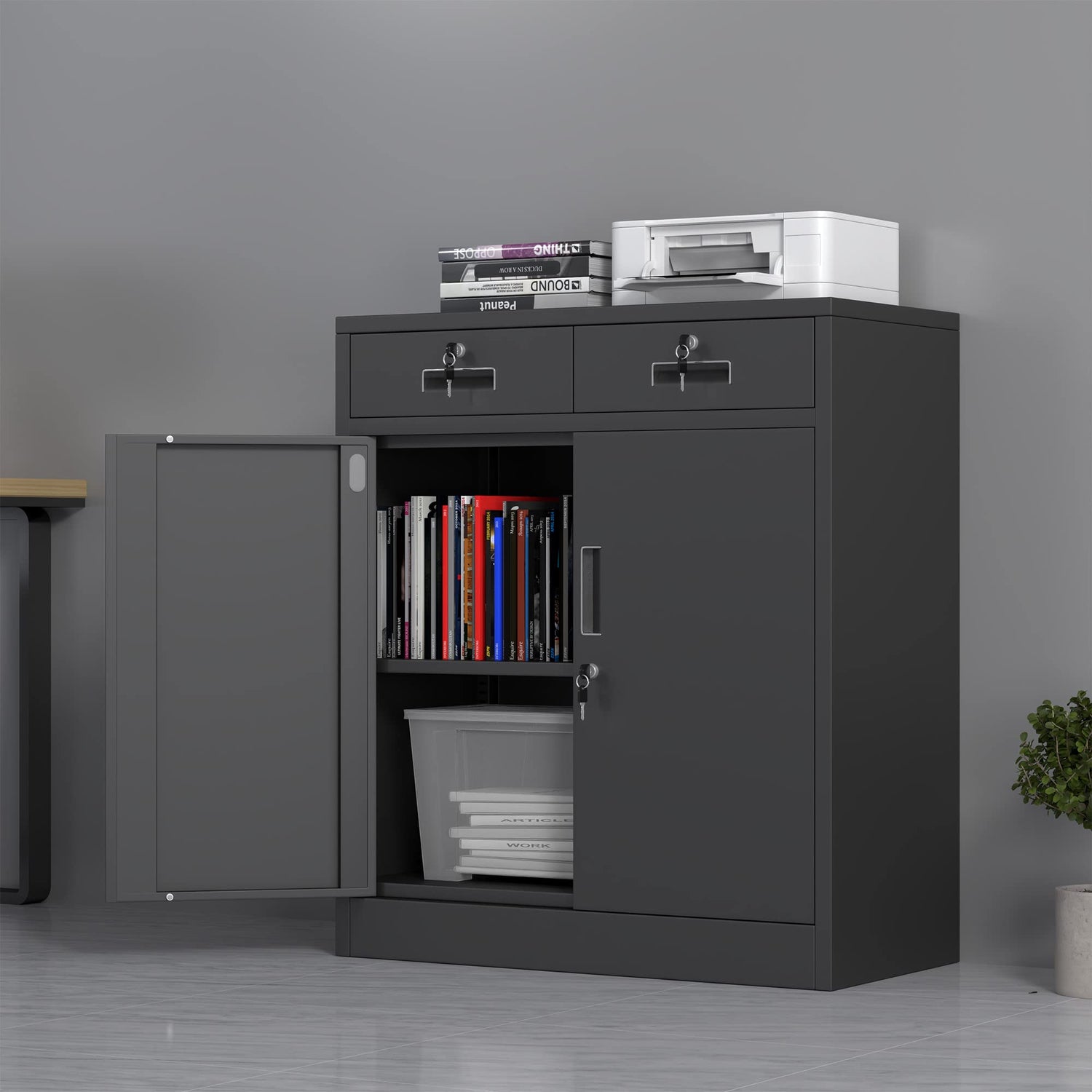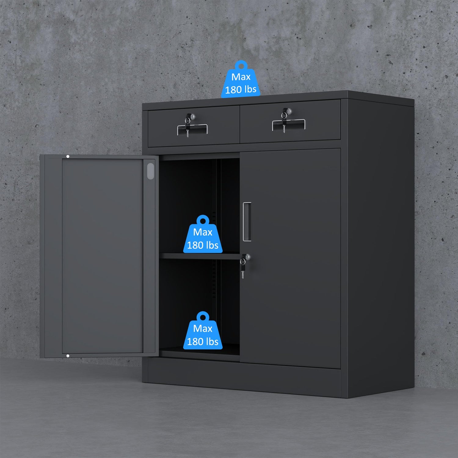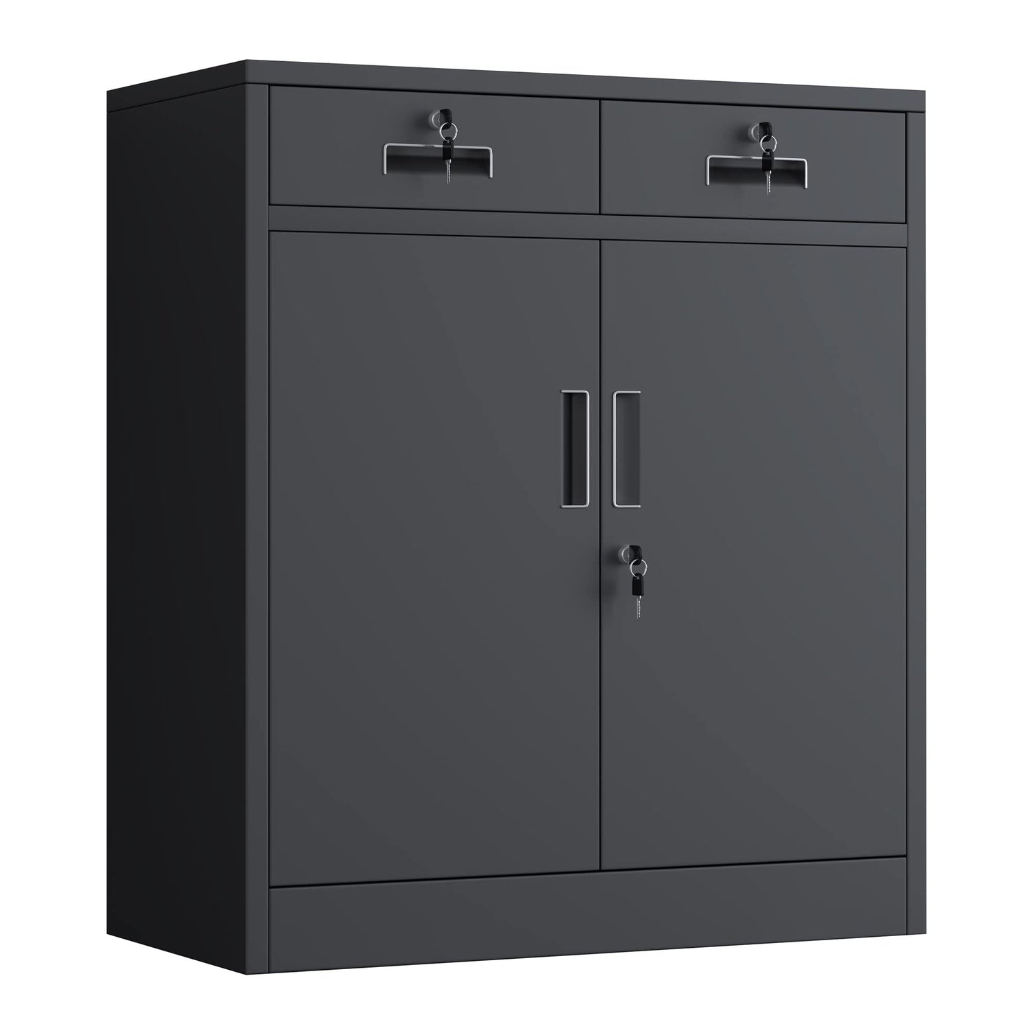 JINGUR Metal Storage Cabinet with Locking Doors and 2 Drawers, Lockable Storage Cabinets with Adjustable Shelf for Home Office and Garage (Black)