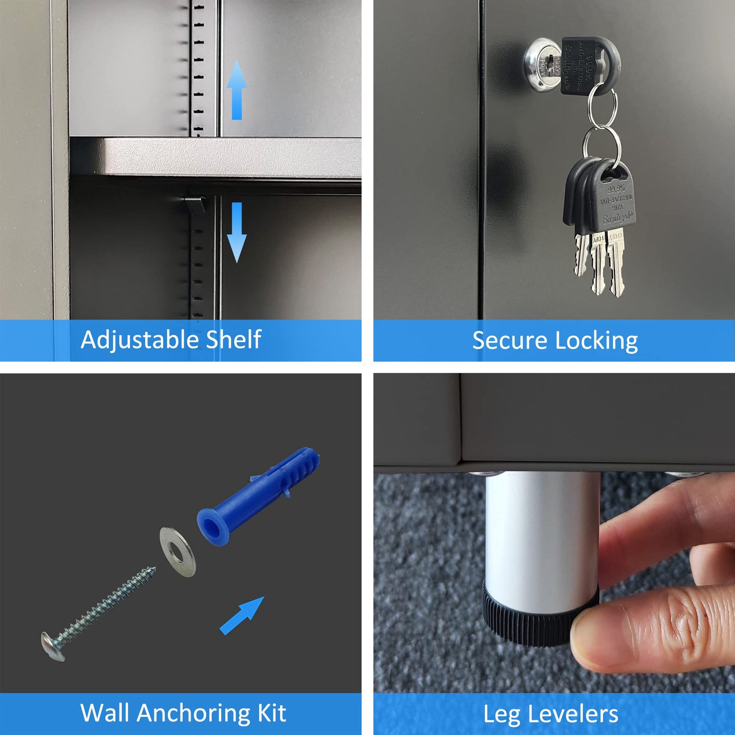 - ADDED STABILITY & SECURITY - This small metal cabinet comes with leg levelers for uneven floor, and optional wall anchoring kit for anti-tipping purpose