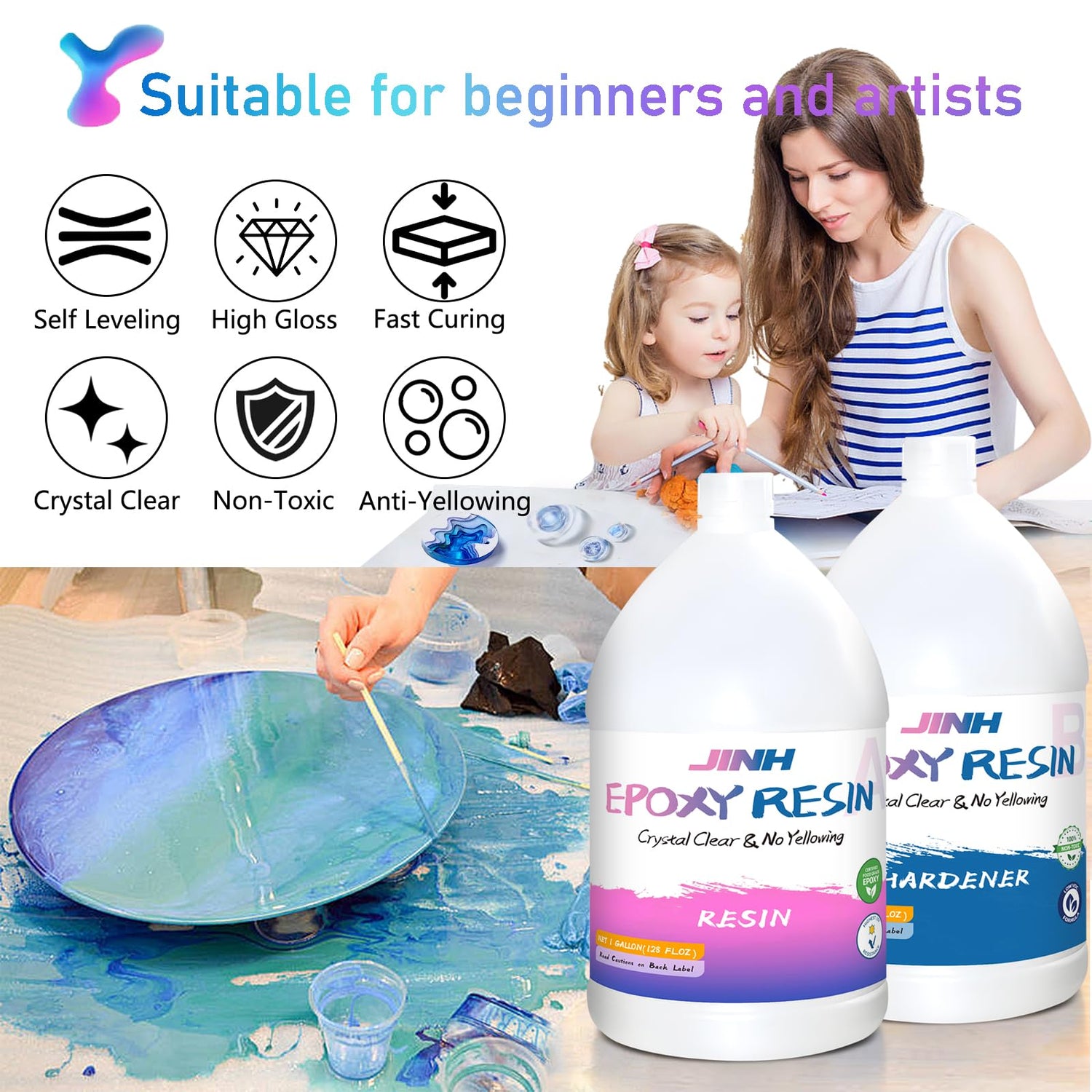 JINH Epoxy Resin 2 Gallon, Upgraded Crystal Clear Epoxy Kit UV Resistant No Bubble Self Leveling, 1 Gallon Resin and 1 Gallon Hardener Kit for DIY Art, Jewelry, Resin Art, Molds, Countertops